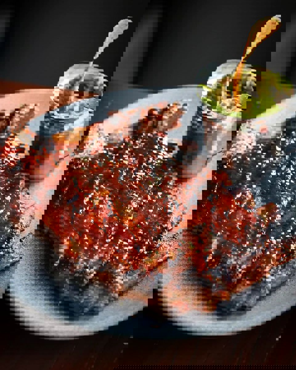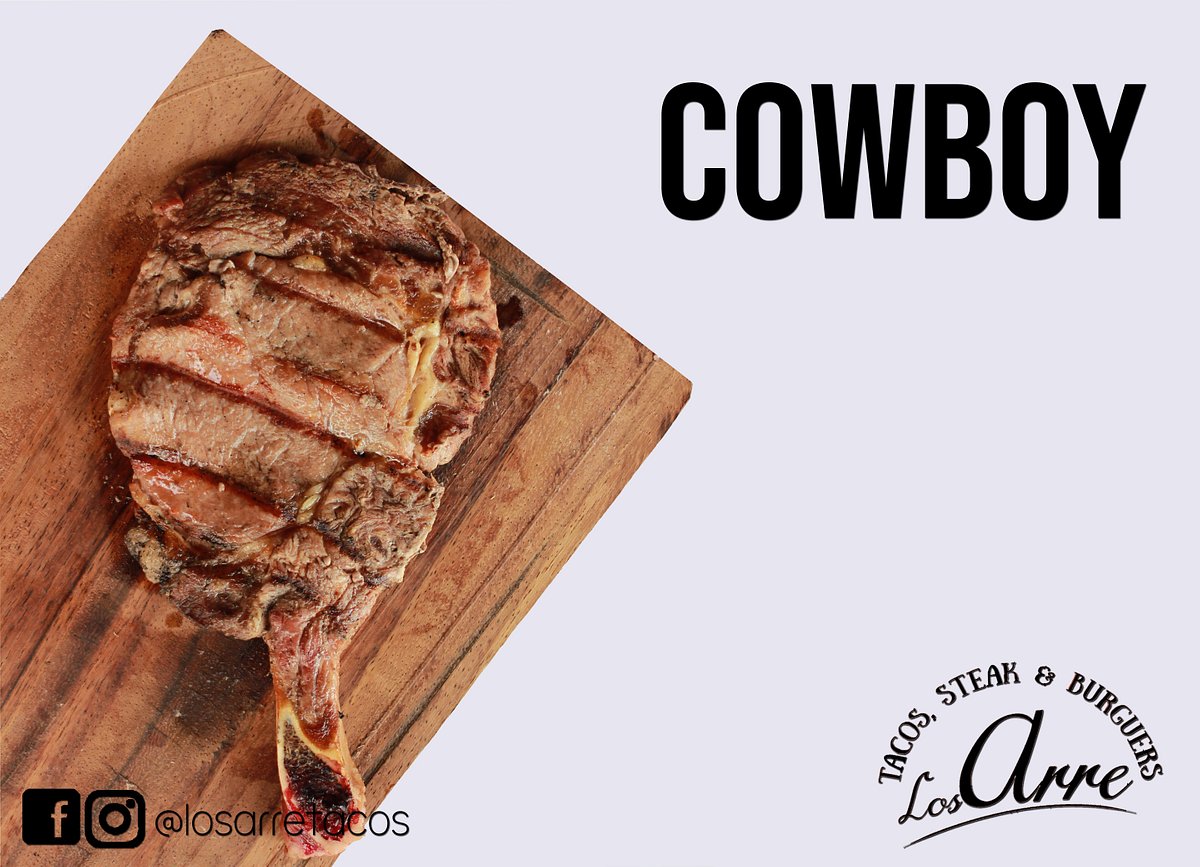 .400GRS DE COWBOY STEAK CON HUESO, SELLADO AL CARBÒN, UN CORTE ROBUSTO PARA VERDADEROS AMANTES DE LA CARNE ACOMPAÑADO DE CEBOLLITA GUISADA, CHILE TOREADO, TORTILLAS DE MAIZ Y GUARNICION A ELEGIR.