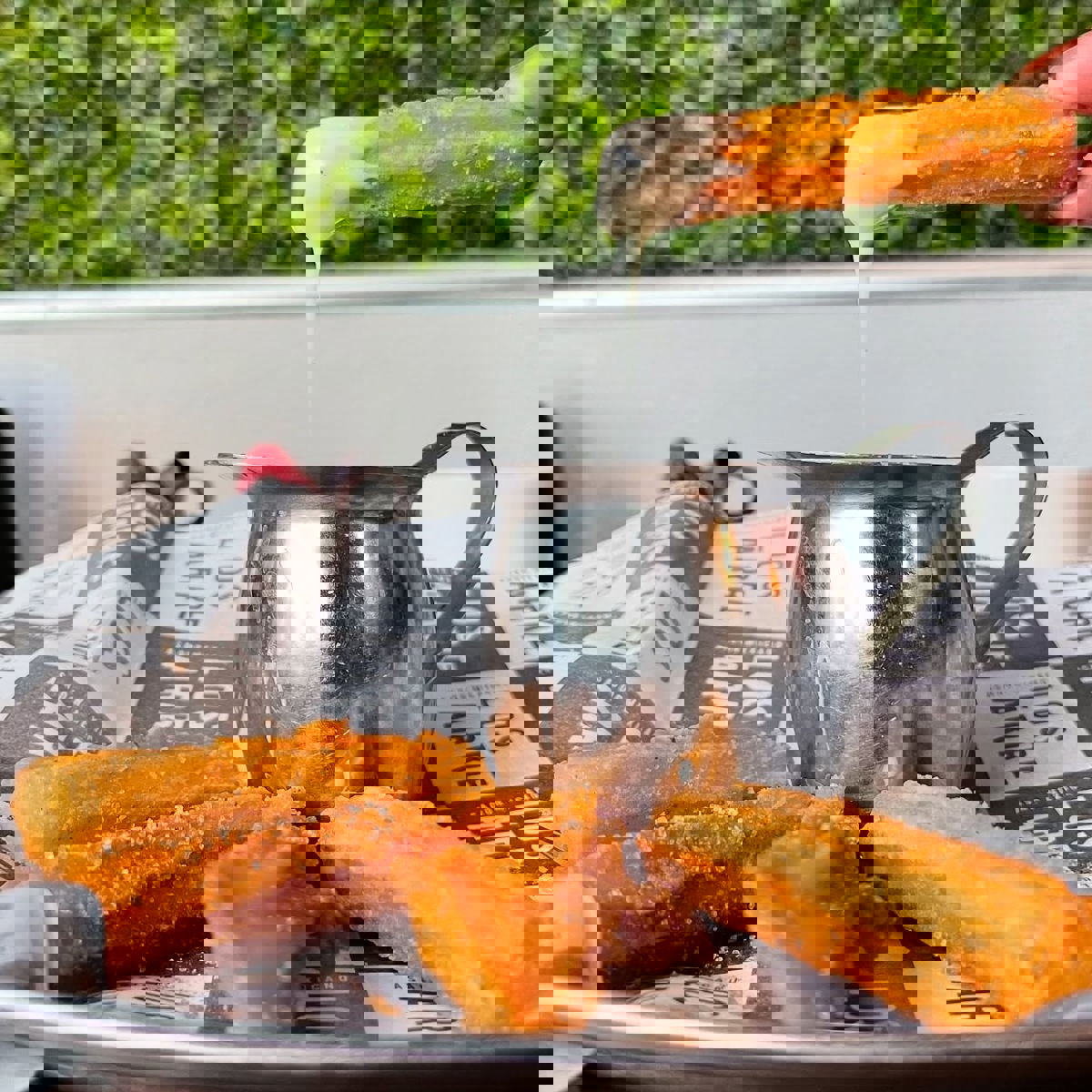 6 CHURROS DE ESPOLVOREADOS CON CANELA Y AZUCAR ACOMPAÑADO DE UN DIP DE LECHERA