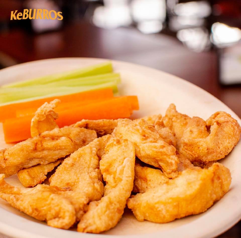 6 tiras de pollo empanizado, apio, zanahoria y aderezo ranch.