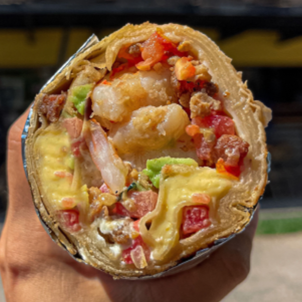 Camarón, queso, aguacate, tomate fresco, mayonesa, aderezo chipotle, chile güerito tatemado, tocino y queso crema.