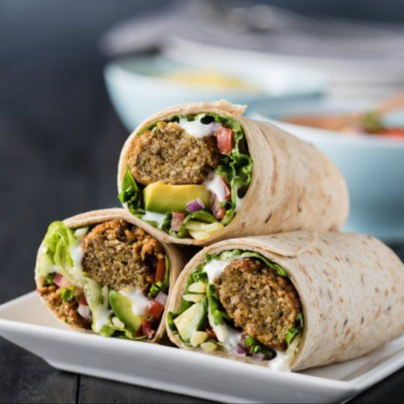 Falafel de garbanzo con receta de la casa, queso, lechuga, zanahoria, aguacate, chile verde, queso crema y aderezo de cilantro.