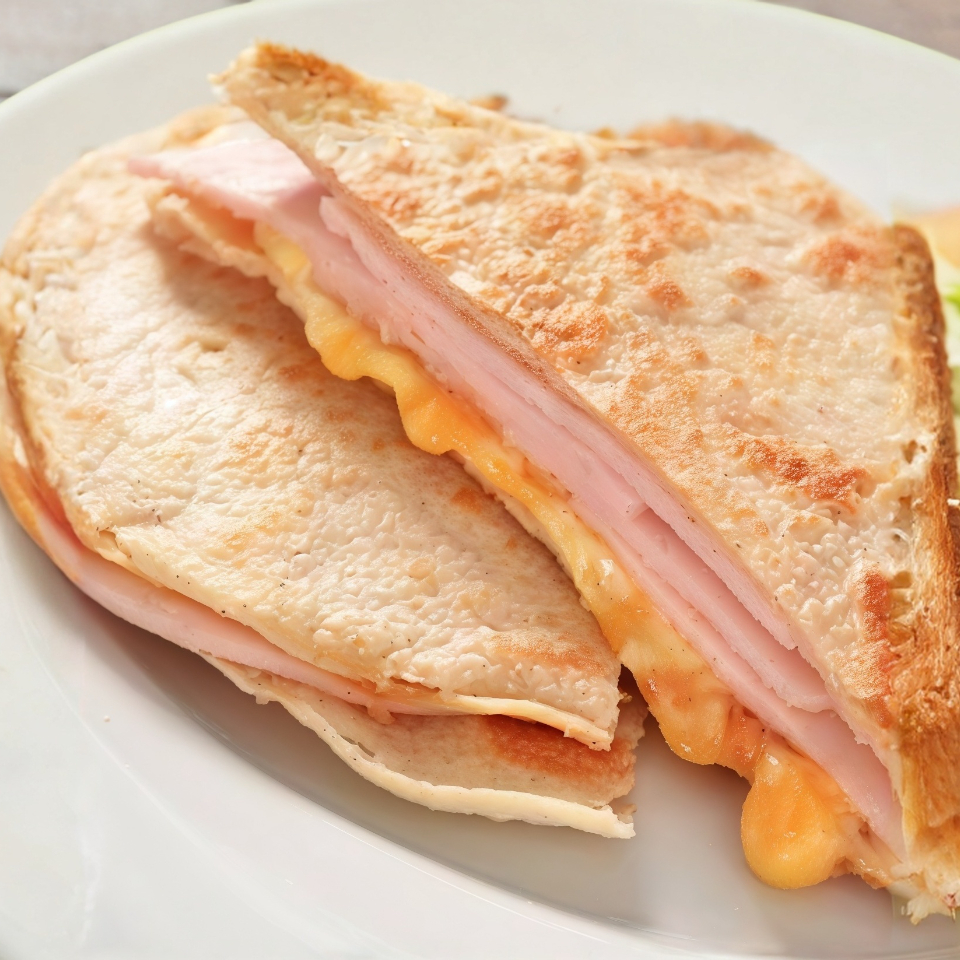 Jamón queso oaxaca queso amarillo verdura salsas una tortilla de harina familiar.