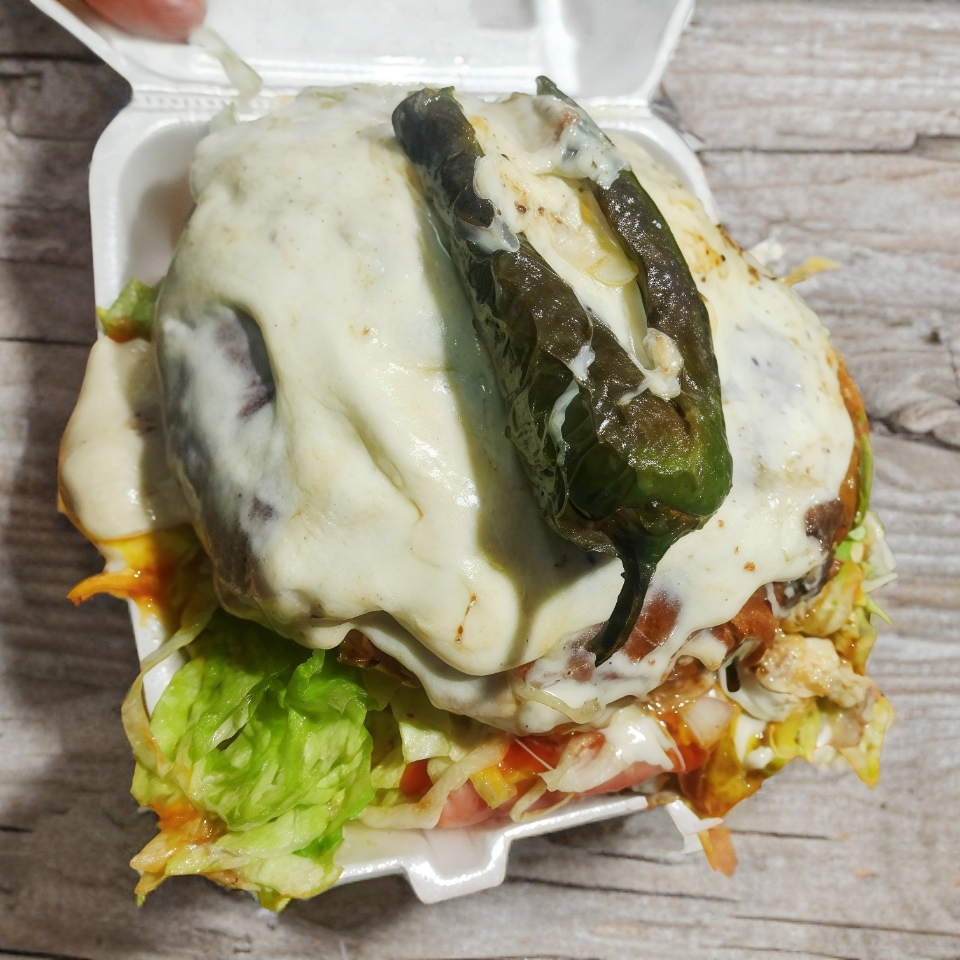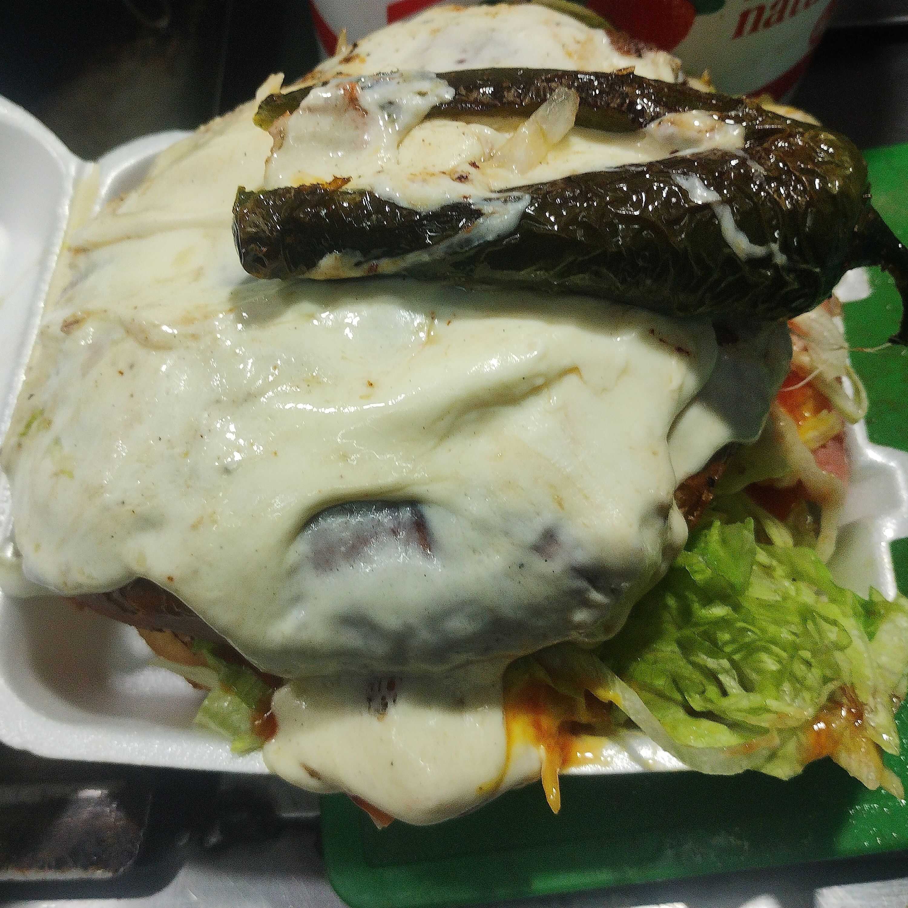 Hamburguesa mamalona chica bañada de queso oaxaca Piña jamón queso oaxaca queso amarillo carne verdura. pepinillos fruta envinagre chiles toreados cebollita guisada