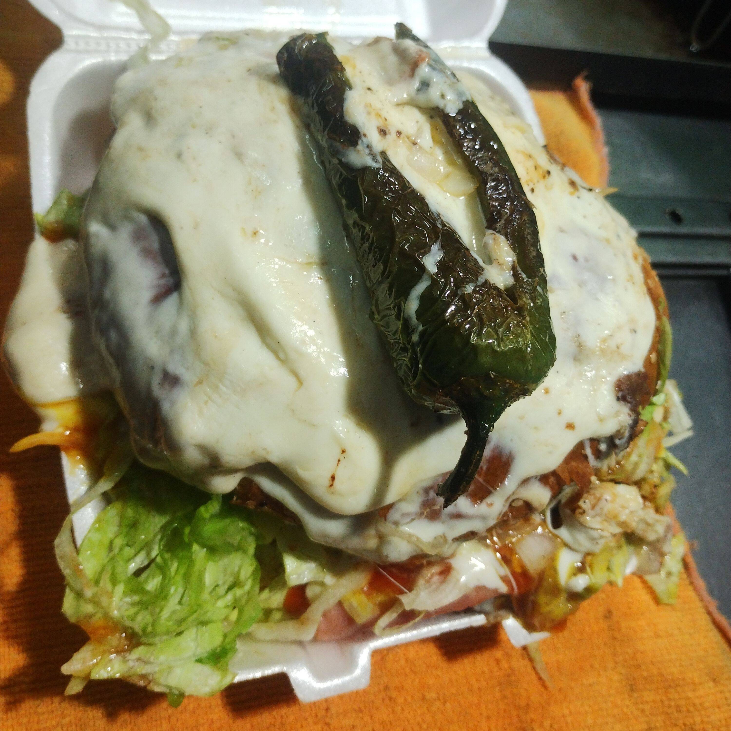 hamburguesa mamalona chica Salchicha jamón carne queso amarillo queso oaxaca lechuga jitomate cebolla chiles toreados cebollita guisada adereza ketchup crema mostaza mayonesa chiles jalapeños fruta envinagre