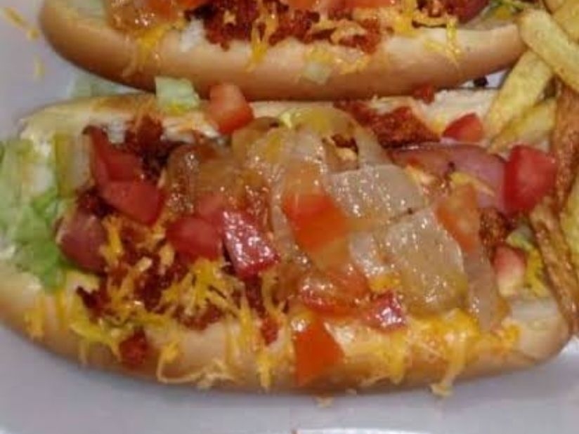 tres panes con salchicha tocino jitomate cebolla ketchup crema mayonesa mostaza chiles toreados cebollita guisada pepinillos aderezo