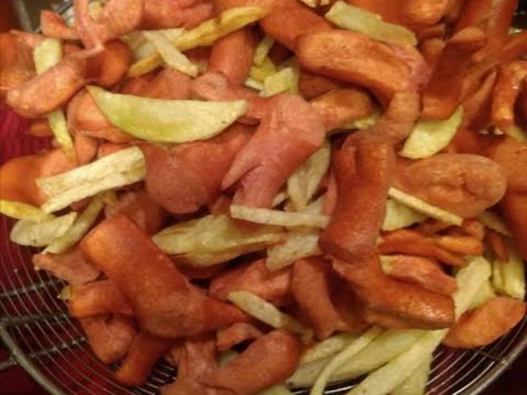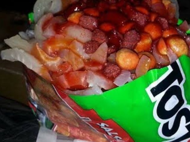 Salchicha cueritos pepino jicama cacaguate rielitos piña o mango salsa magui chile chamoy clamato.