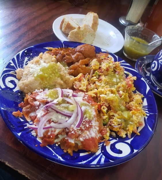Huevos preparados al gusto del cliente (revueltos, rancheros) acompañados de chilaquiles y frijoles fritos.