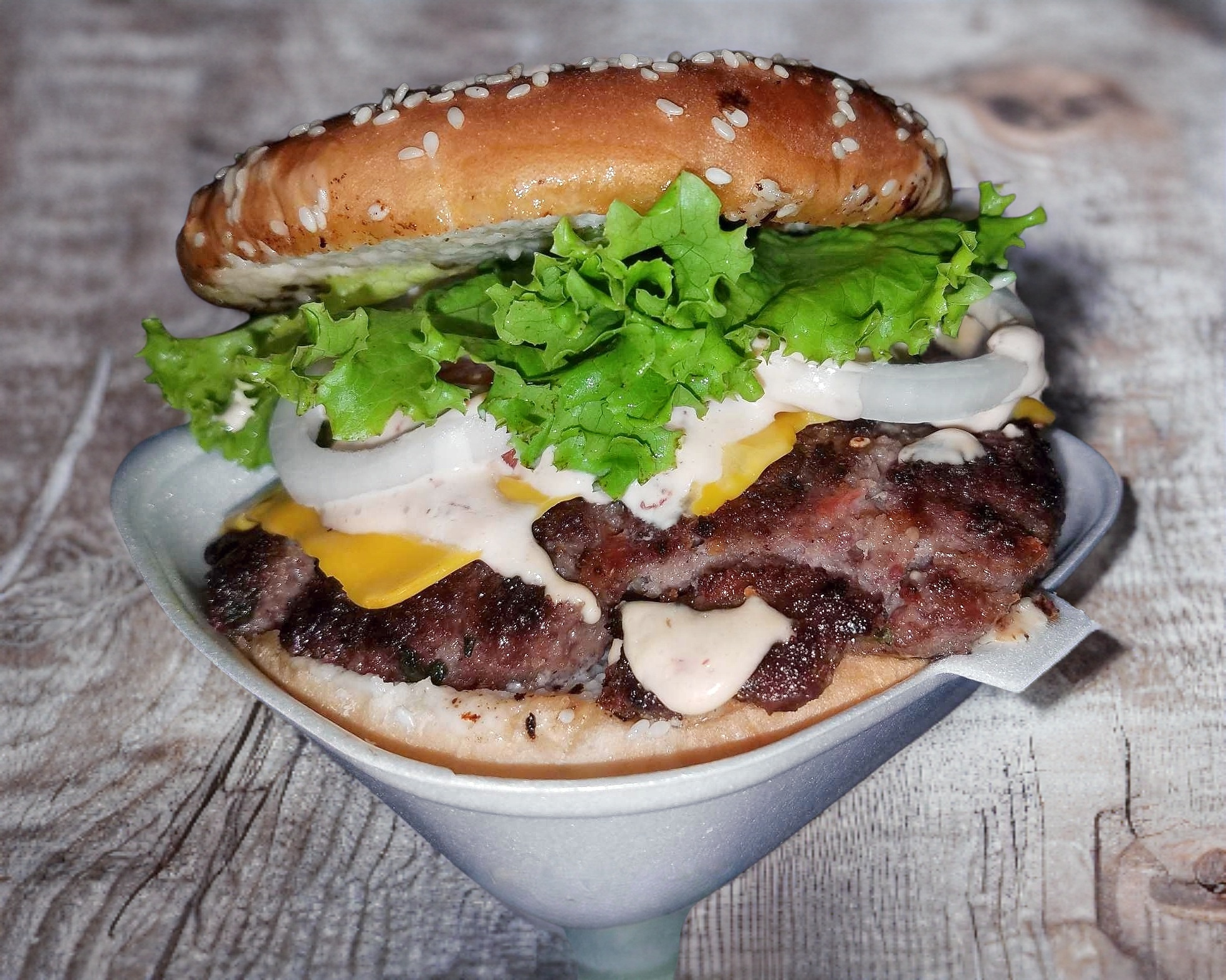 150 gr. de jugosa carne de res, acompañada de salchicha, queso mozzarella, jitomate cebolla, cátsup y mostaza.