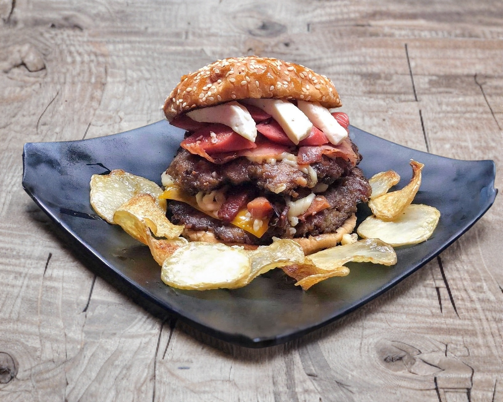 Doble carne de 140gr, acompañada de quezo mozarella, queso panela, salchicha, tocino y jamon
