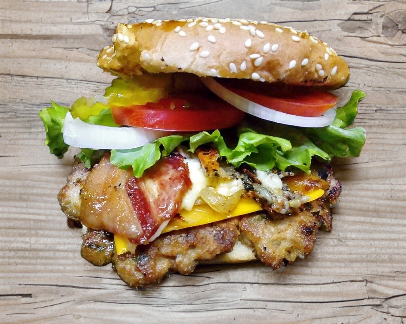 150 gr. de carne, tocino, cebolla gusada, queso mozzarella un aderezo artesanal (jitomate, cebolla, pepinillos, cátsup y mostaza).