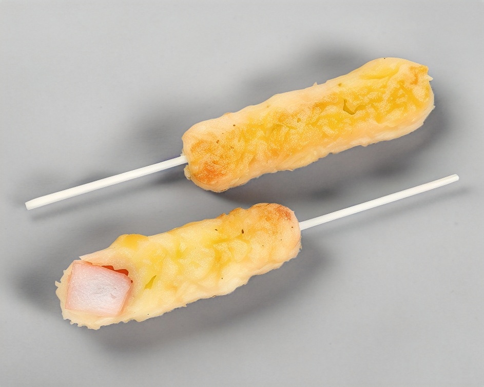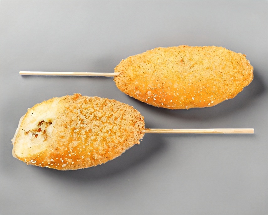 Rollo empanizado, (P/D) Filadelfia, pepino, aguacate, tocino y pollo con queso gouda. . (P/F) queso amarillo.