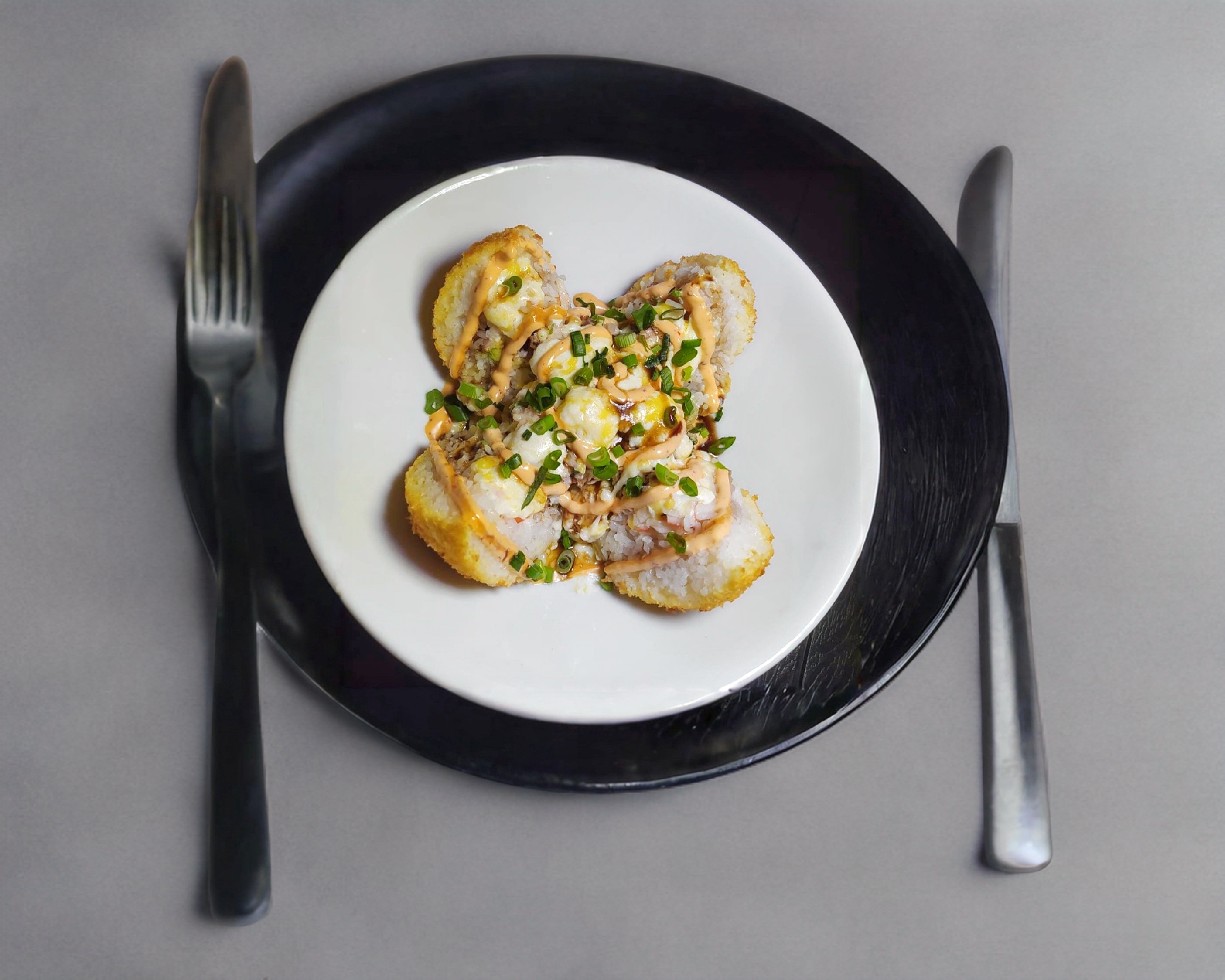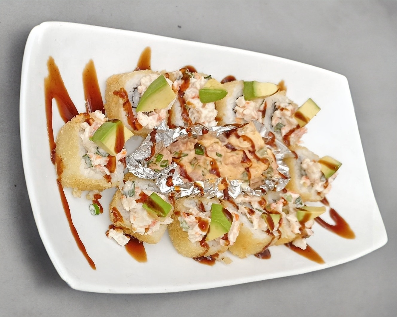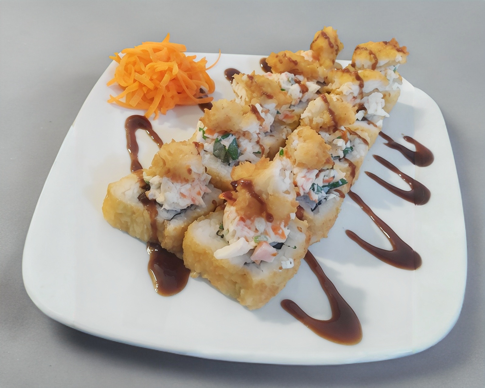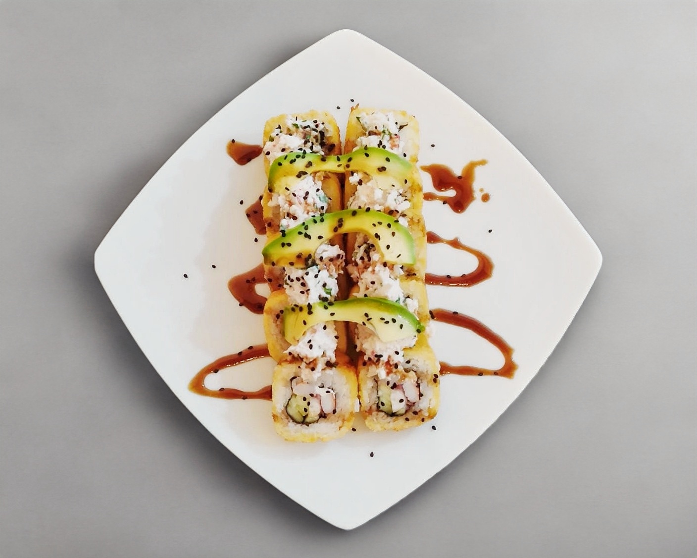 Rollo empanizado, (P/D) Philadelphia, pepino y aguacate, (P/F) tampico, cubitos de aguacate, pollo Crunchy y salsa de anguila.