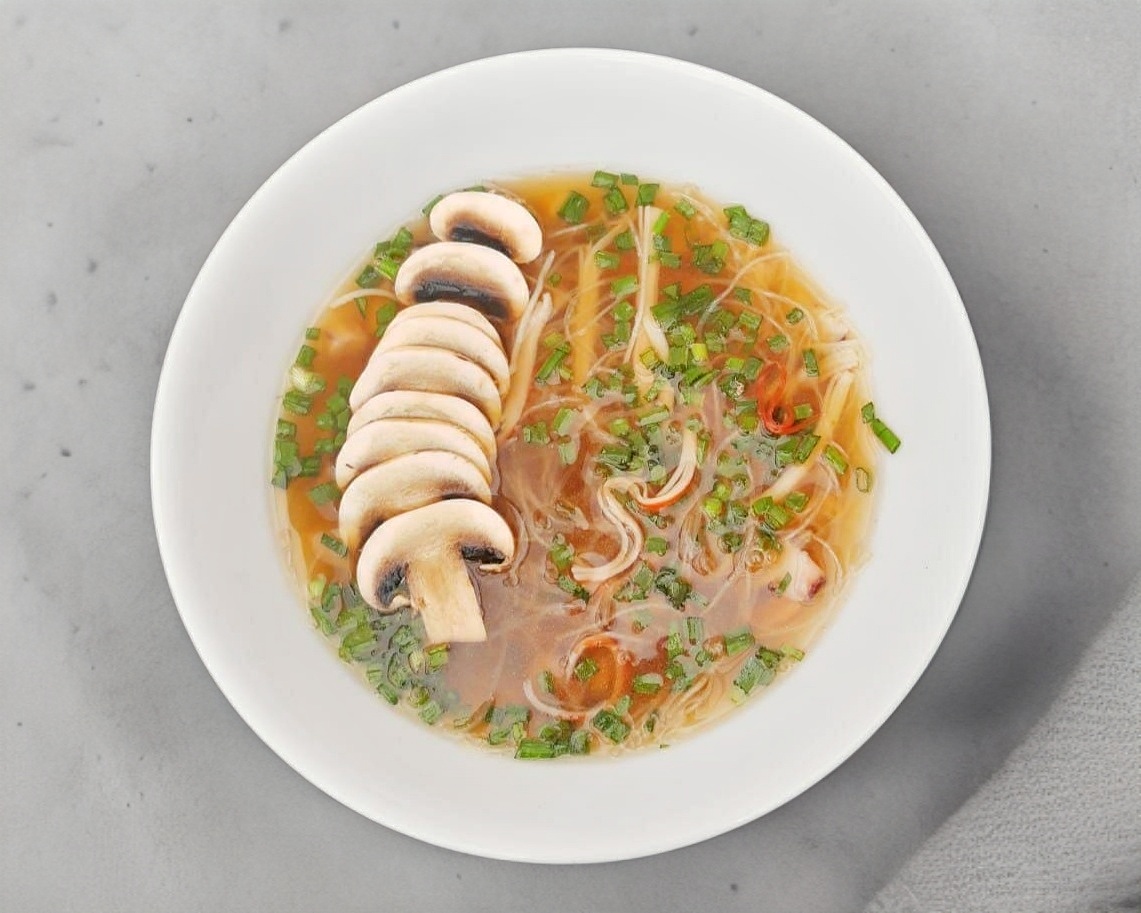 pollo, champiñon, cebollin, fideos de arroz, en caldo de camarón picante.