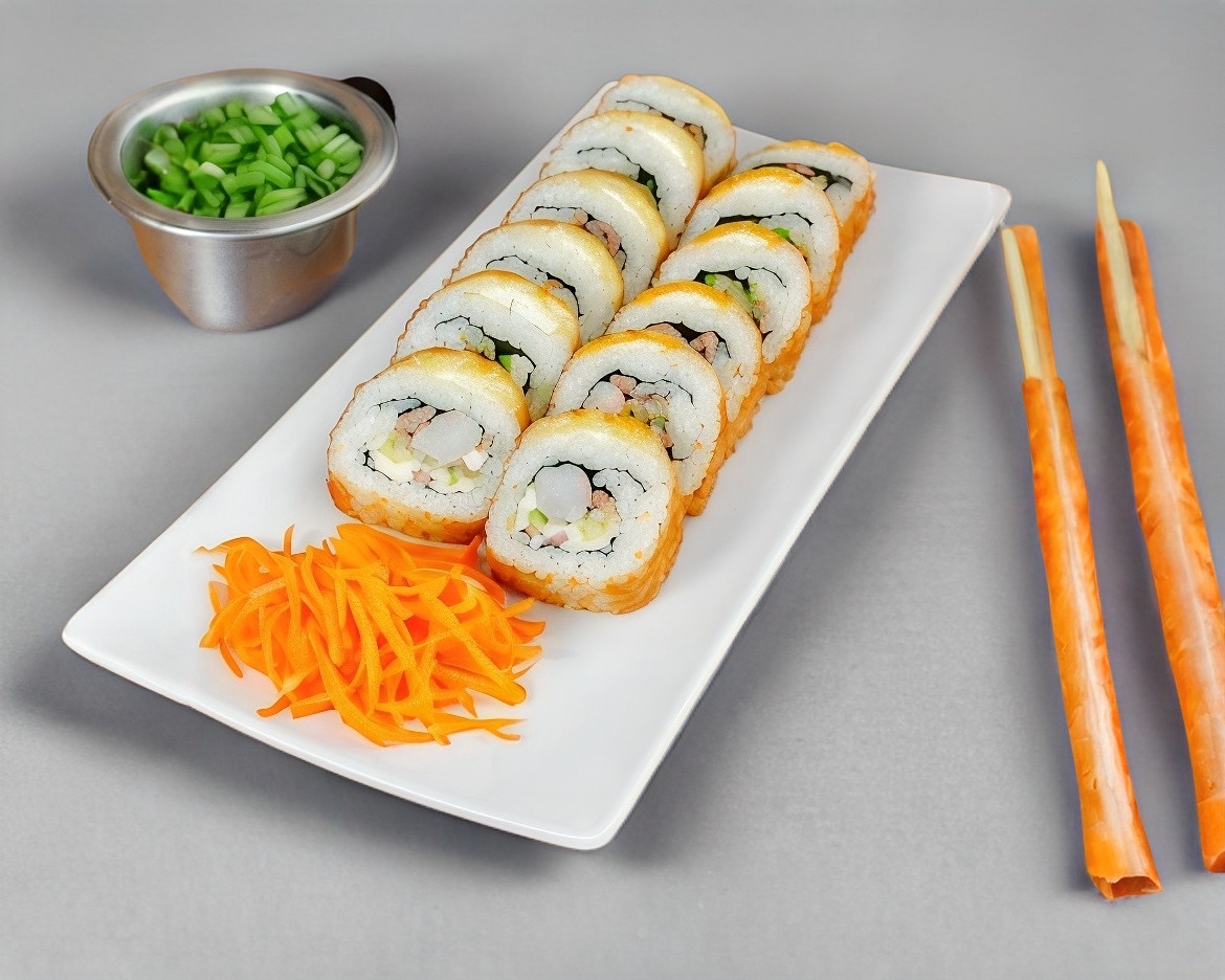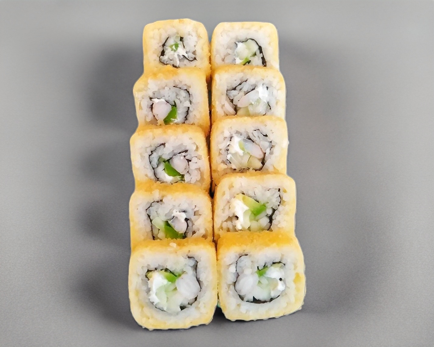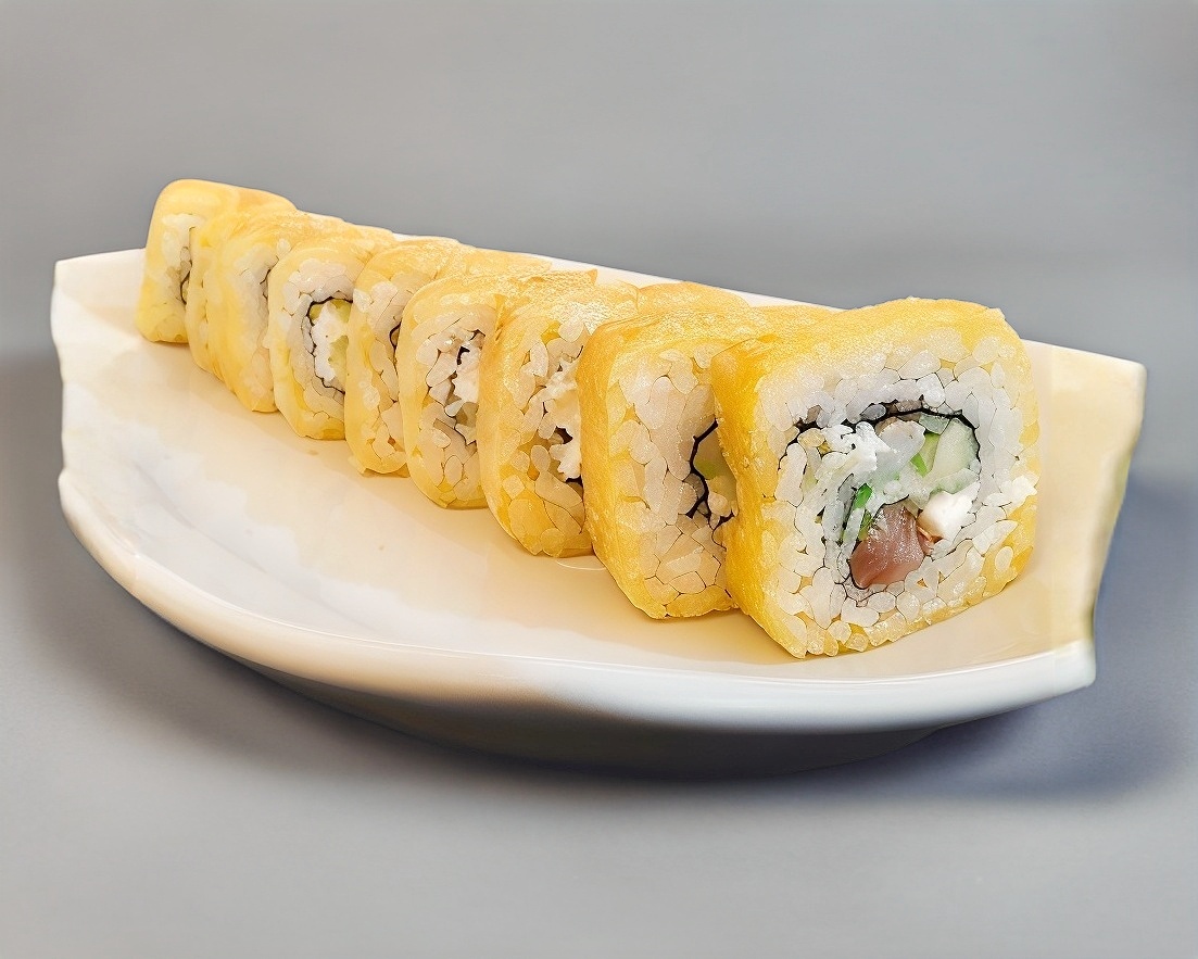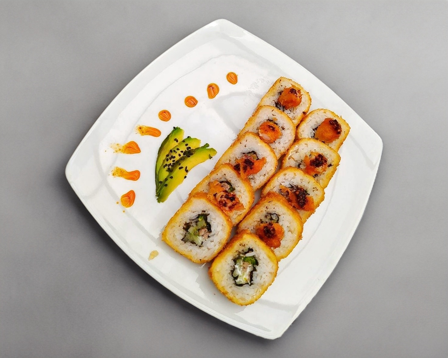 Media Porción de Sushi Empanizado, (P/D) Philadelphia, pepino, aguacate, + proteína a elegir (camarón, surimi, pollo o res).