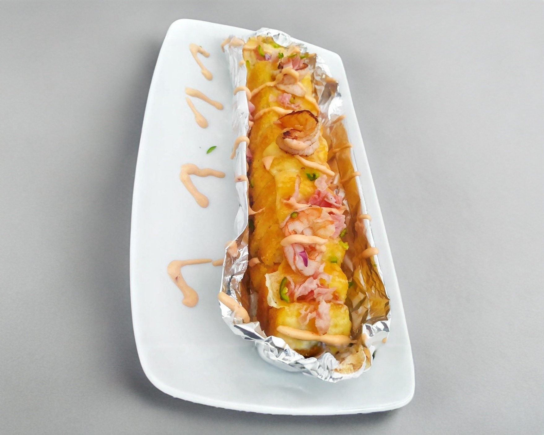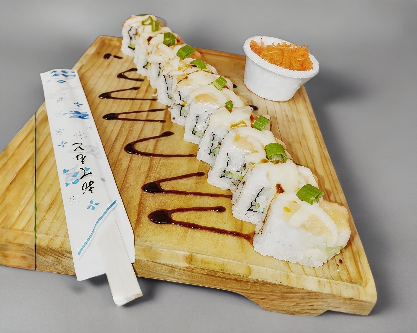 (P/D) Philadelphia, pepino, aguacate y res, (P/F) gratinado de queso gouda, tocino, chile serrano, camarones a la mantequilla y aderezo chipotle.