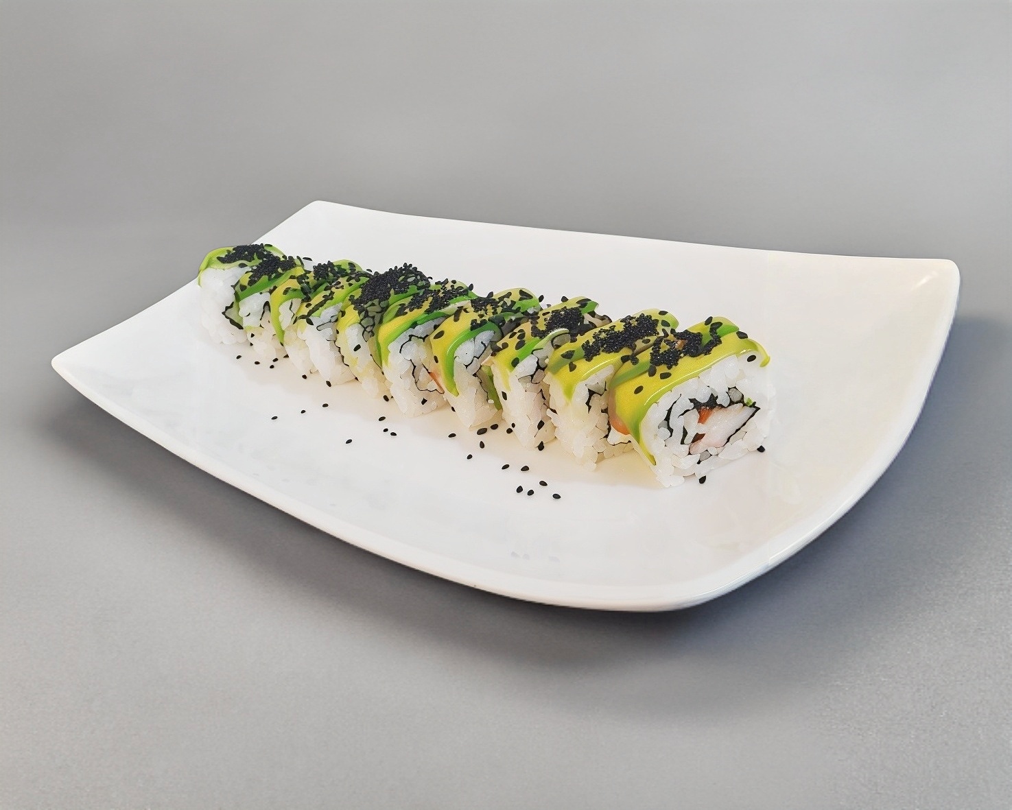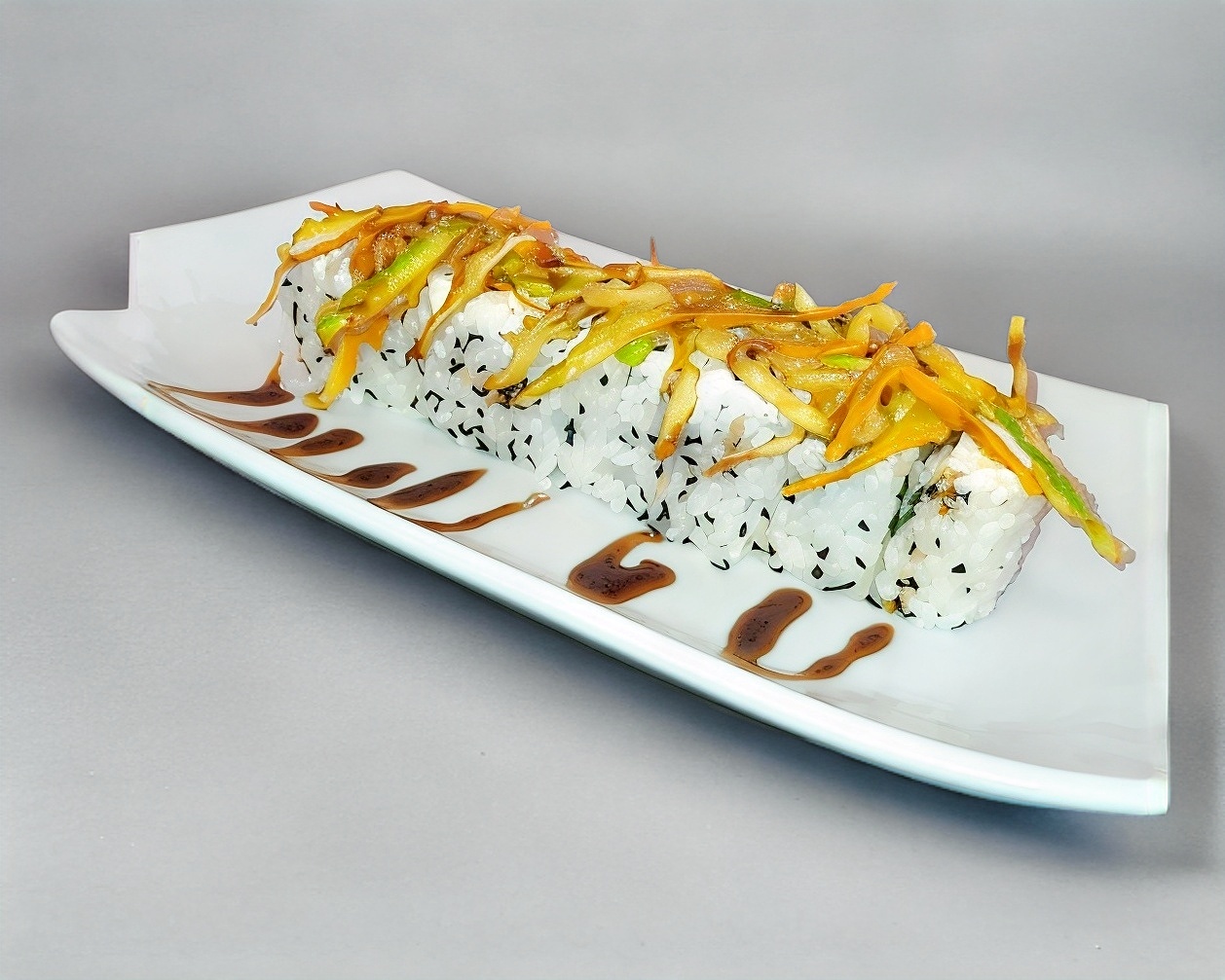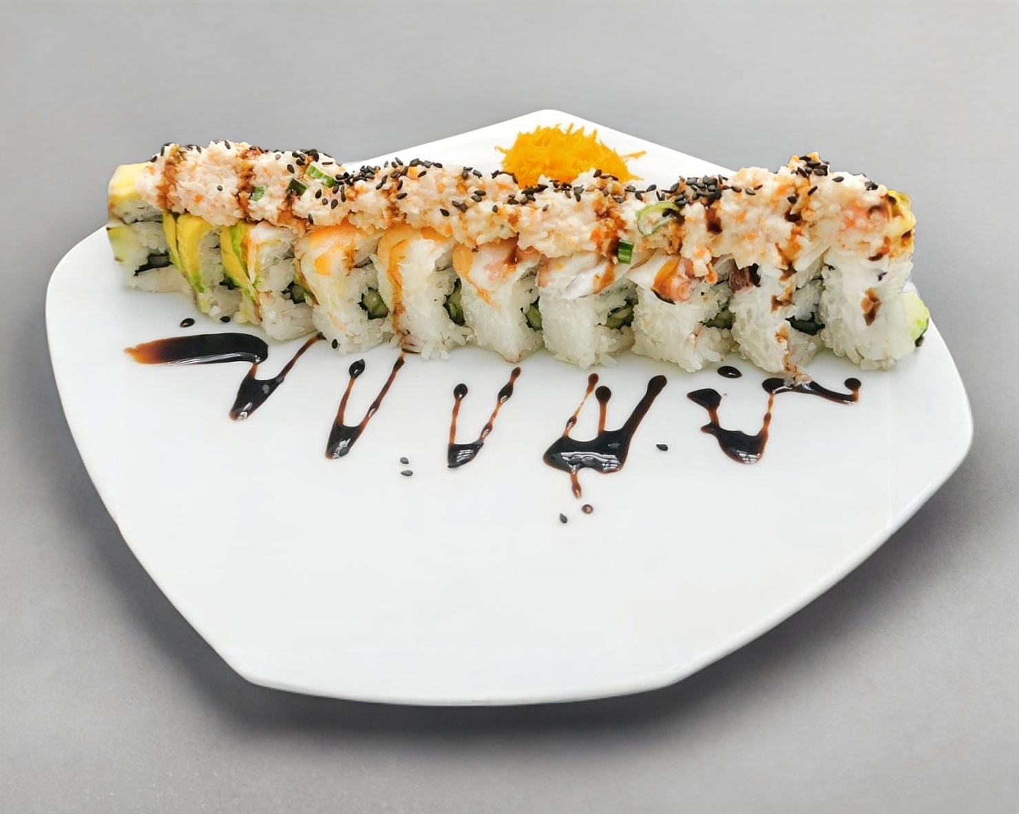 (P/D) Philadelphia, pepino, aguacate y camarón empanizado, (P/F) envuelto en philadelphia, topping de verduras tempura y bañado en salsa de anguila.