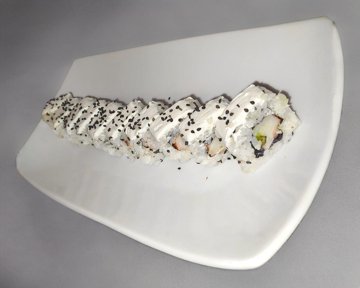 (P/D) Philadelphia, pepino, aguacate, camarón, (P/F) alga capeada, tampico, salsa de anguila y ajonjolí.