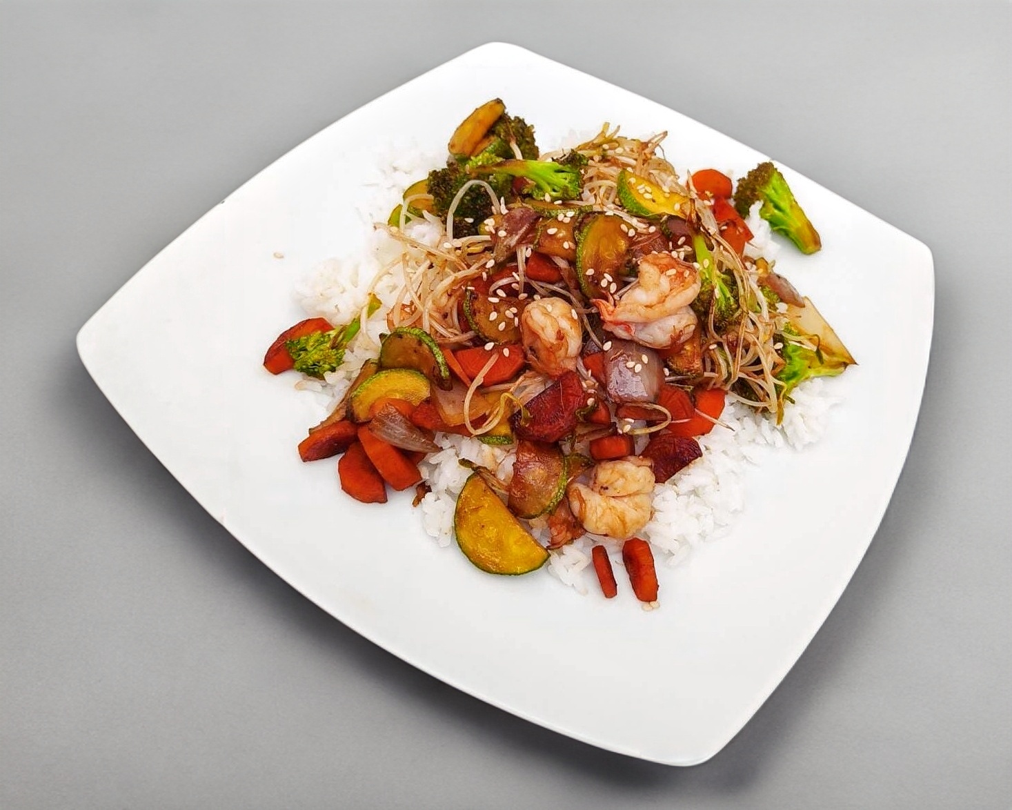 Verduras sazonadas a la plancha (zanahoria, calabaza, brócoli, germinado de arroz y cebolla), en una cama de arroz, + proteína a elegir .