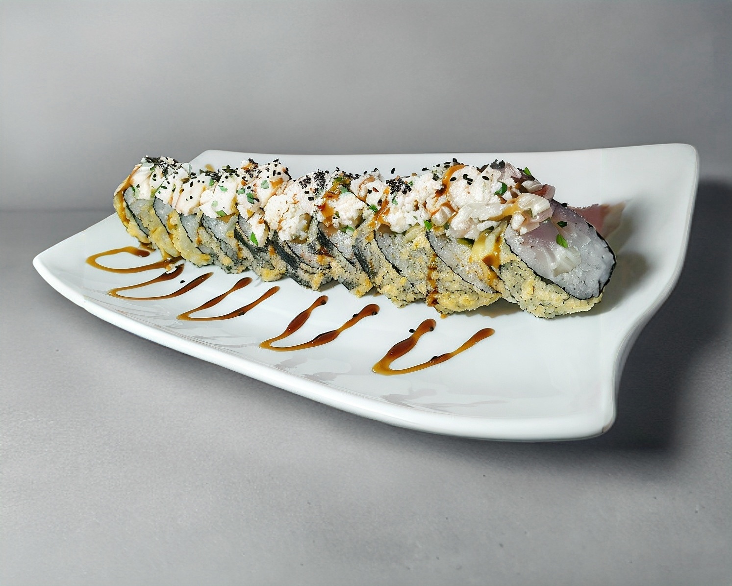 Rollo empanizado, (P/D) Philadelphia, pepino, aguacate y surimi, (P/F) topping de pulpo con camarón, bañado en salsa de anguila.