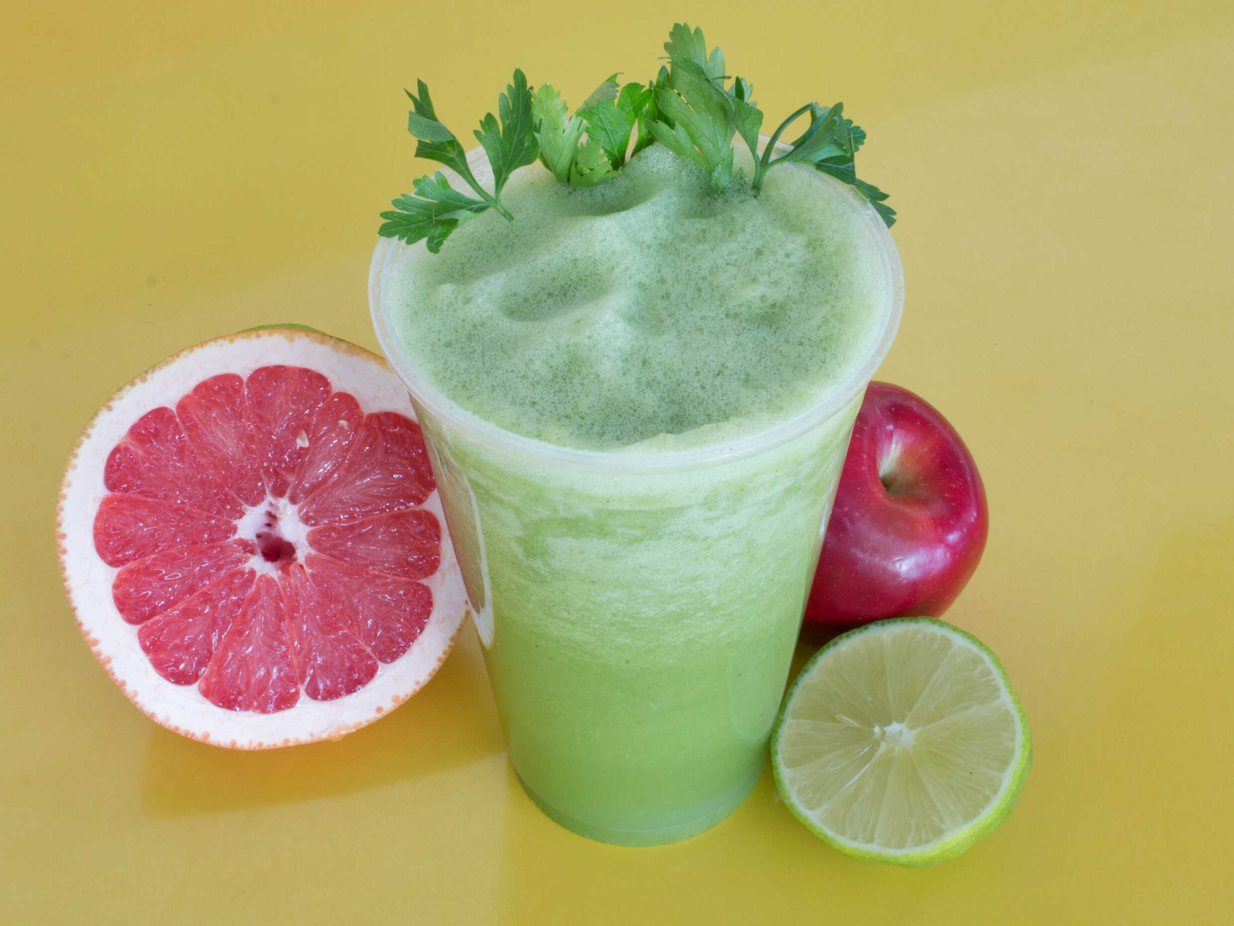 Fresa, piña, melón, manzana, papaya, guayaba y sandia con jugo de naranja y miel.