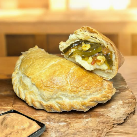 Deliciosa empanada de hojaldre rellena de guiso de rajas con queso mozzarella. Acompañado de aderezo chipotle (Solicítalo).