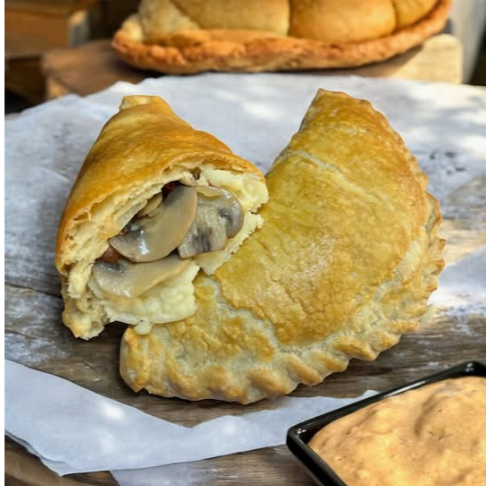 Deliciosa empanada de hojaldre rellena de guiso de champiñones con queso mozzarella. Acompañado de aderezo chipotle (Solicítalo).