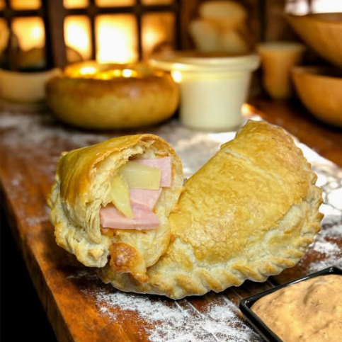 Deliciosa empanada de hojaldre rellena de queso mozzarella, jamón en trozo y piña. Acompañado de aderezo chipotle (Solicítalo).