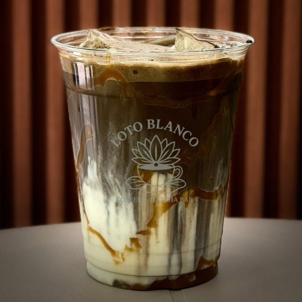 Una bebida cremosa, dulce y terrosa hecha combinando té matcha de primera calidad con rico jarabe de azúcar moreno y leche, a menudo servida con hielo.