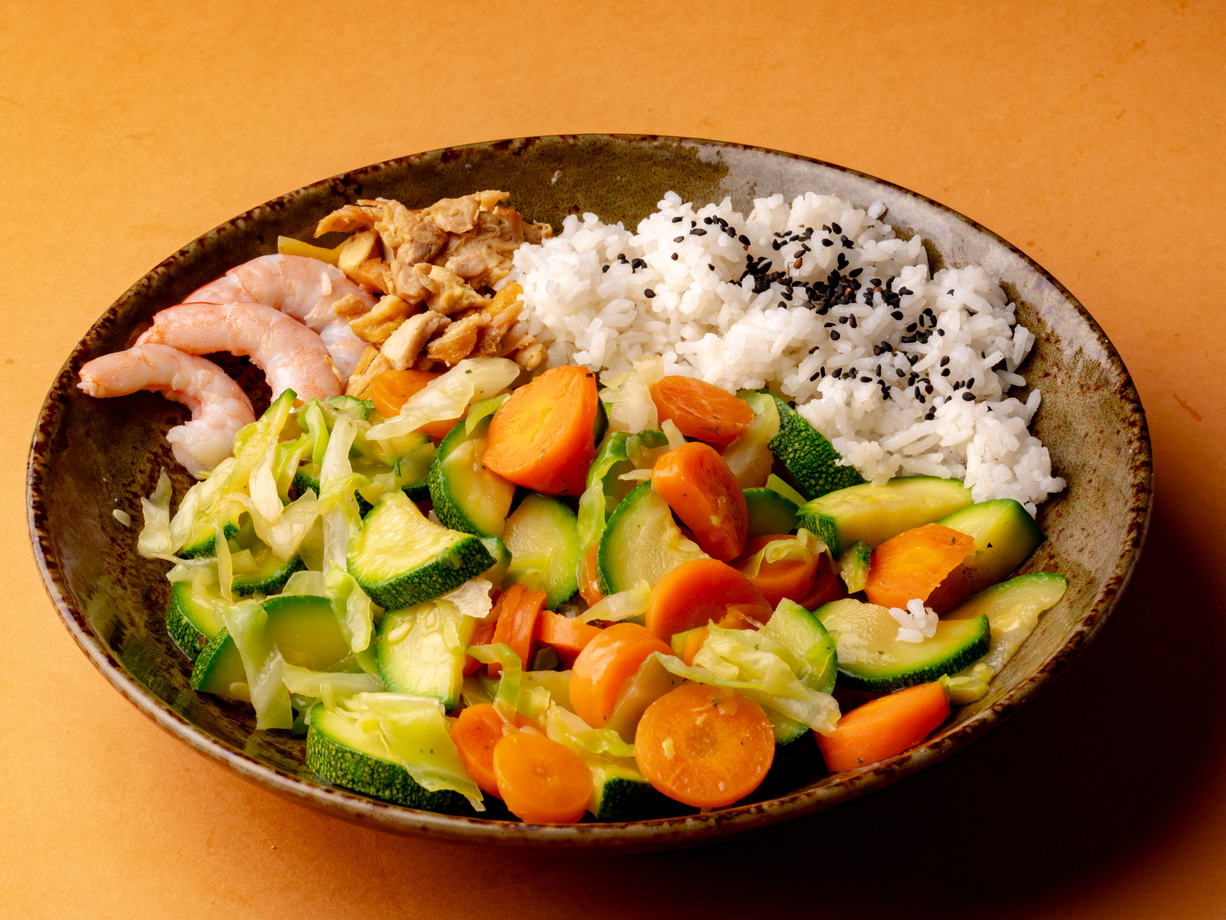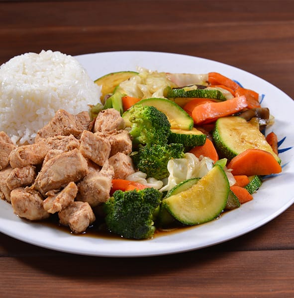 Pollo, res, camarón, champiñones, calabaza,brocoli, col y zanahoria guisados a la plancha, se acompaña de arroz.
