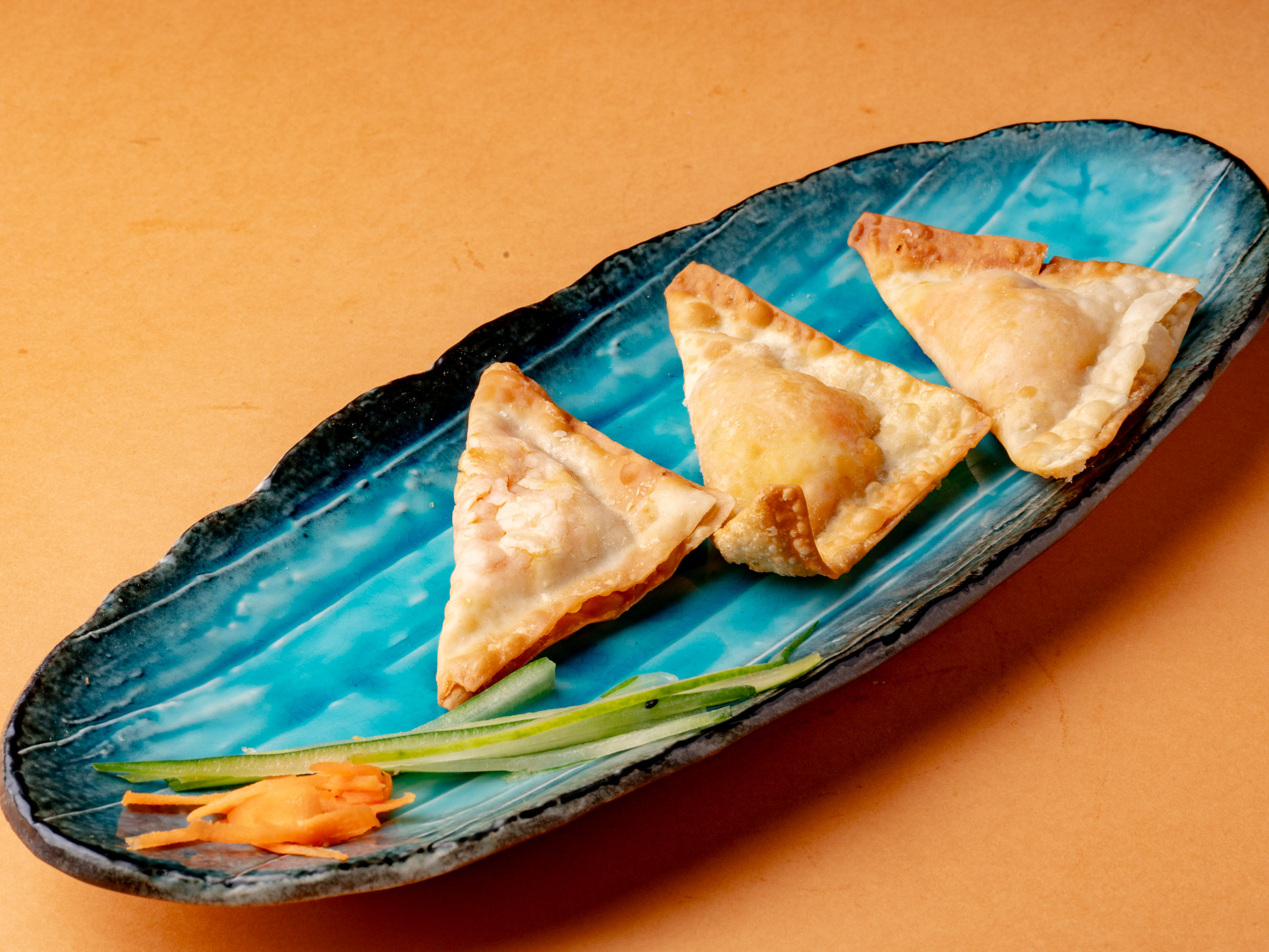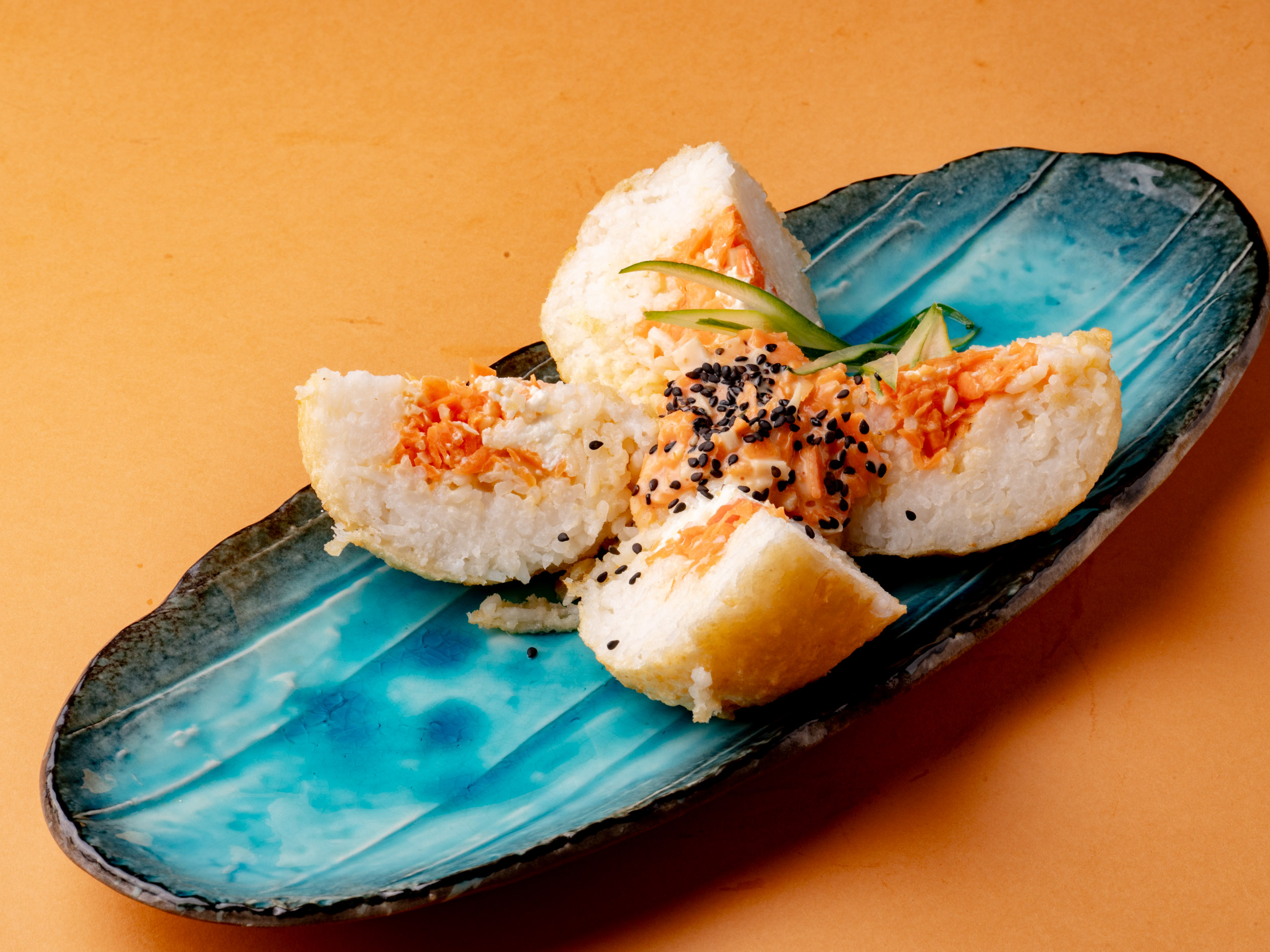3 piezas de pasta crujiente acompañadas con aderezo de curry y relleno de tampico y philadelphia o salmón picante.
