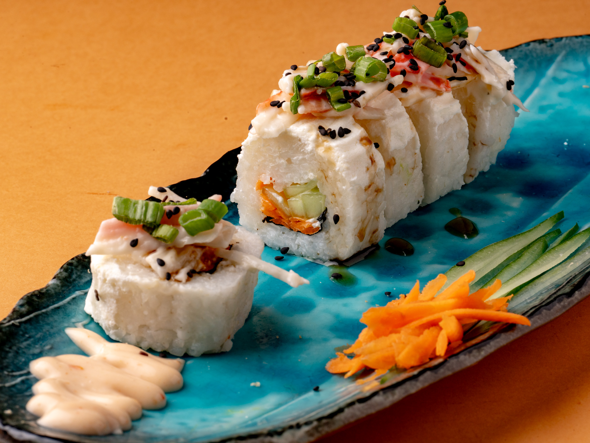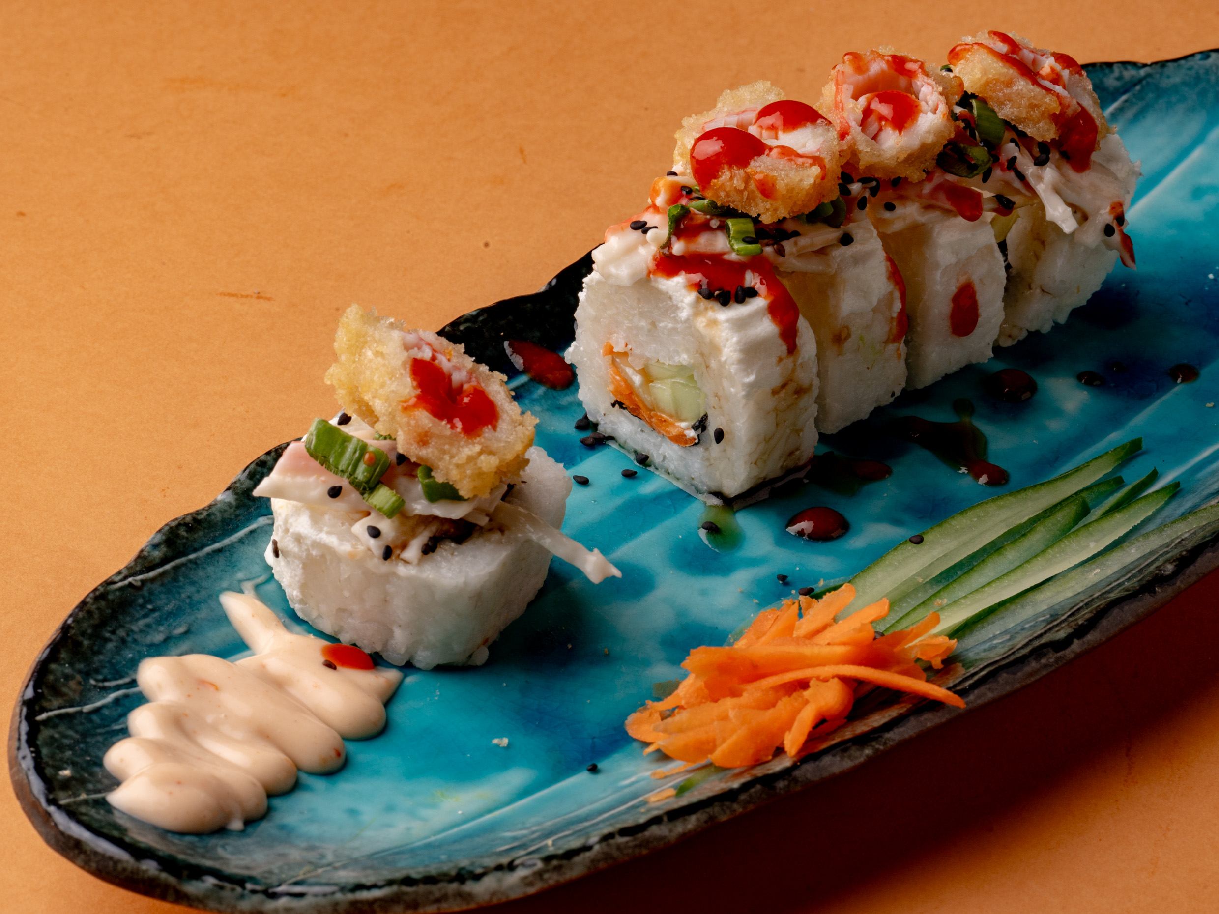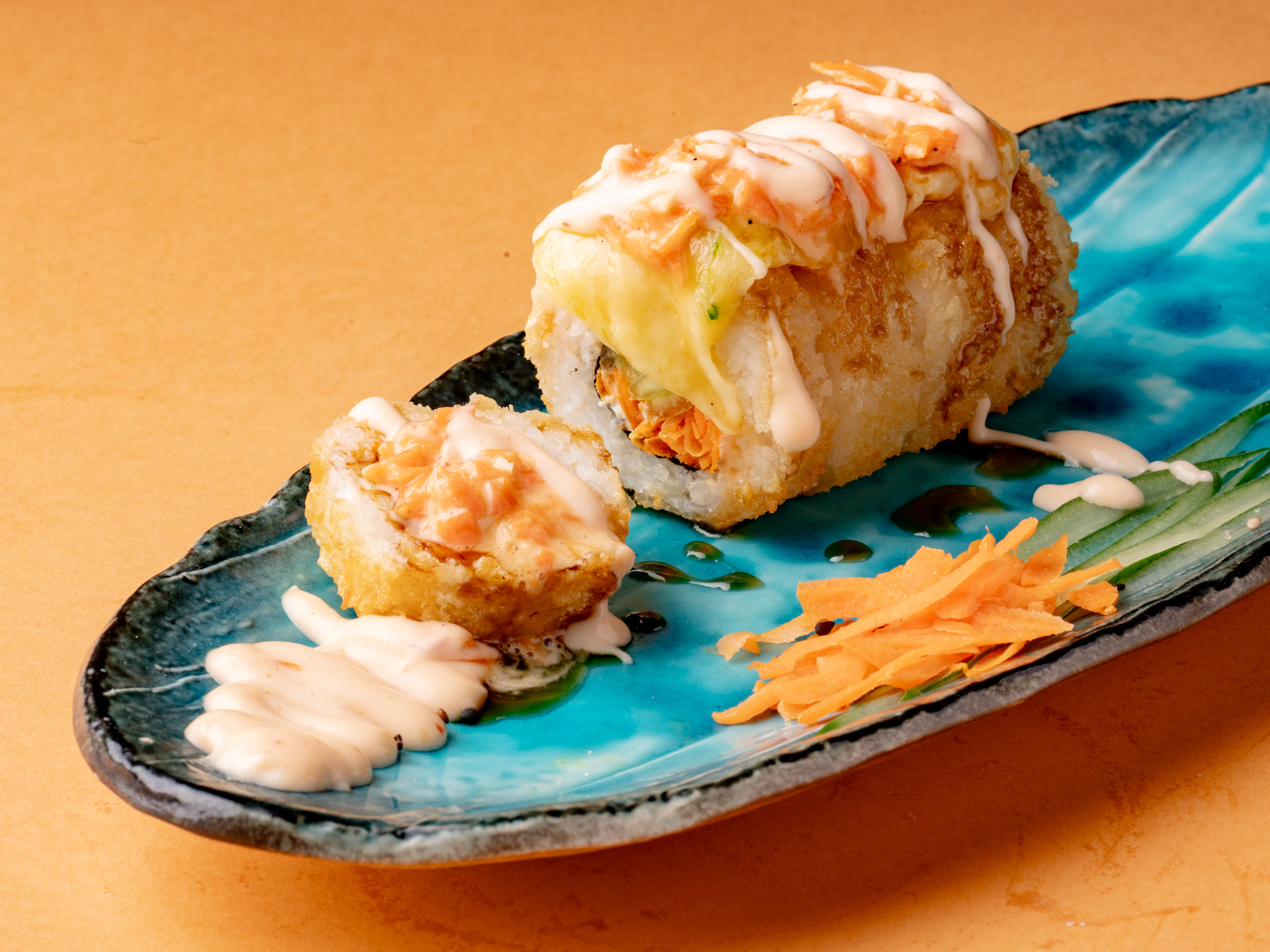 10 ruedas de sushi, Queso philadelphia por fuera, arriba kanicama topping, surimi y queso manchego empanizado, salsa sriracha y cebollin.