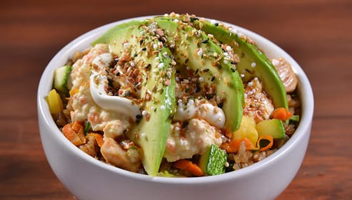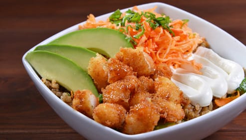 Arroz acompañado de queso manchego fundido, pollo empanizado, aguacate y aderezo chipotle.