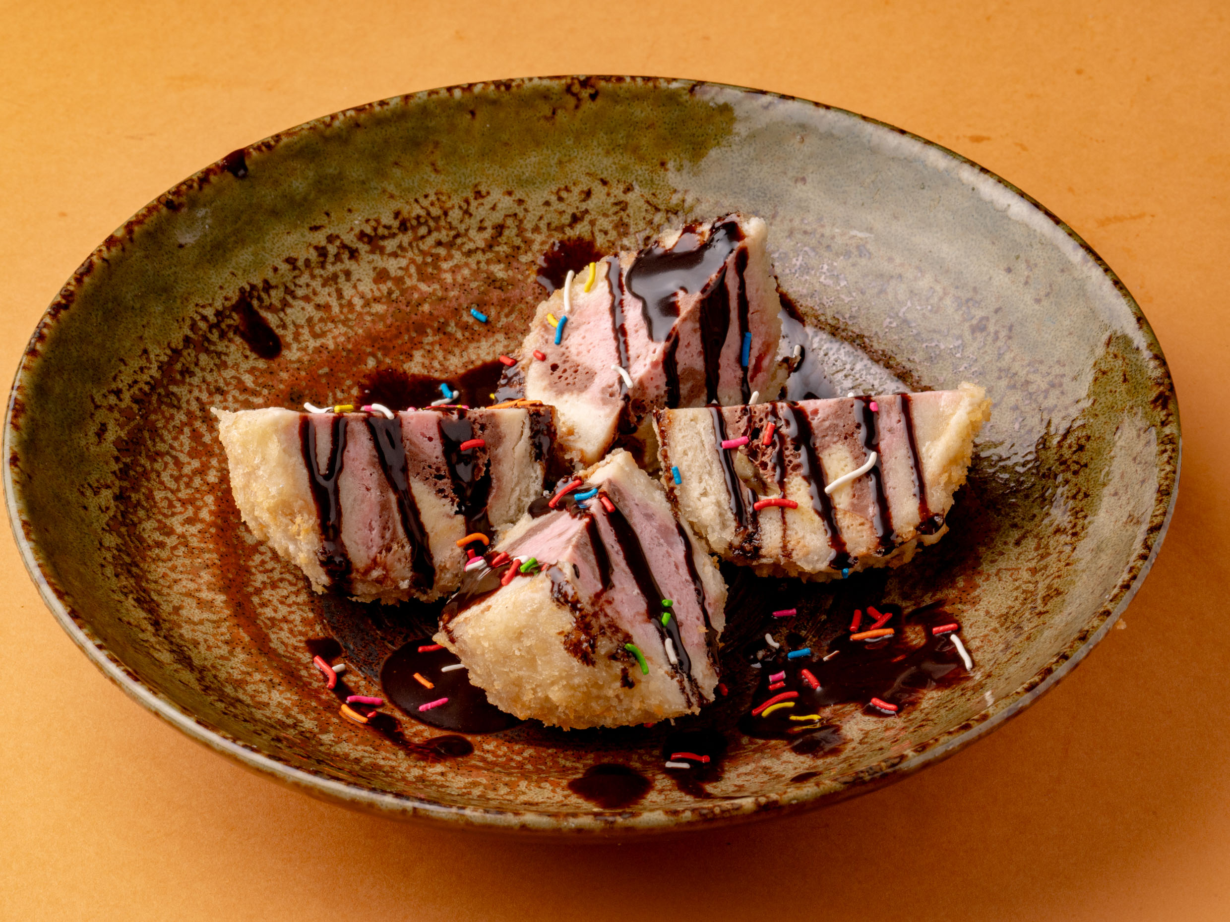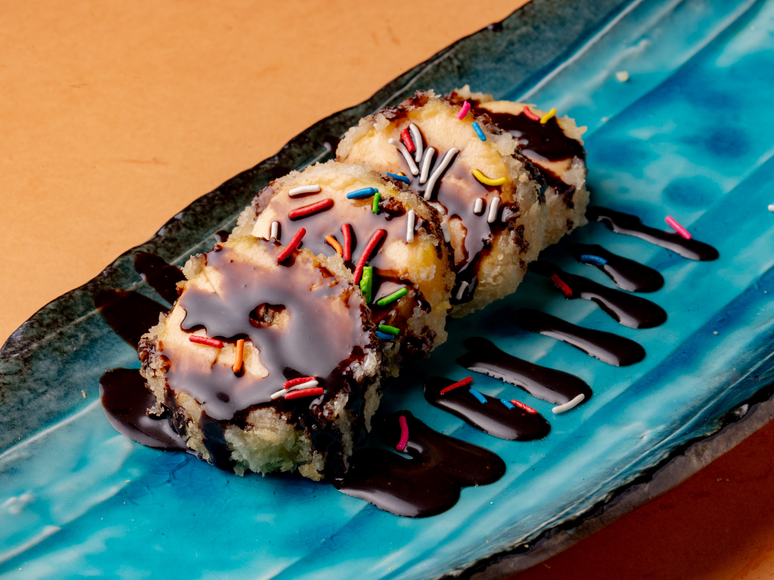 4 rollitos de arina, rellenos de filadelfia y platano, fritos y espolvoreados en azucar