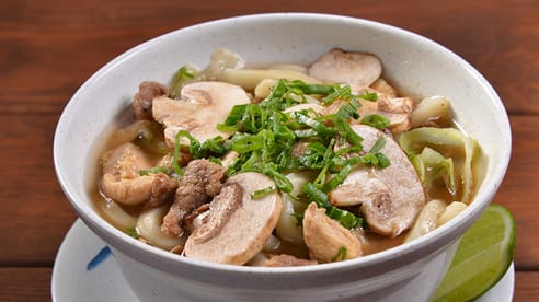 Sopa mizo con pasta udon, pollo, res, champiñones, cebollin y col.