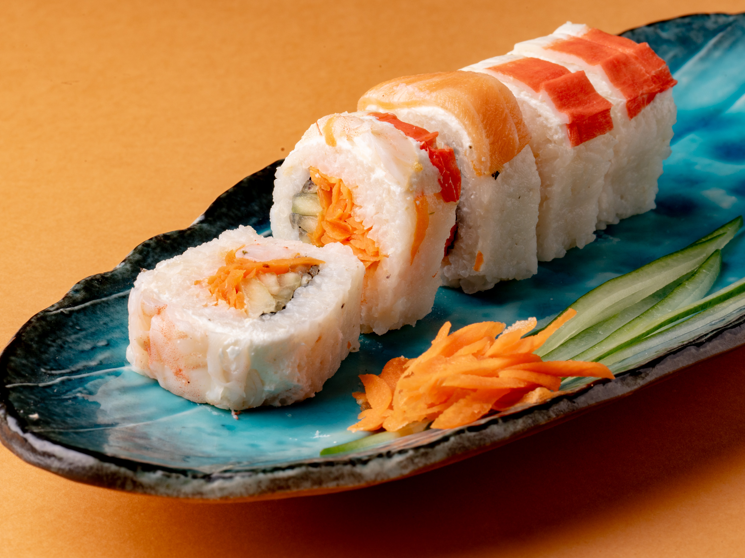 10 ruedas de sushi, Queso philadelphia por fuera, arriba con kanikama topping, ajonjoli, cebollin y salsa de anguila.