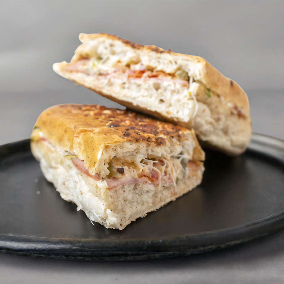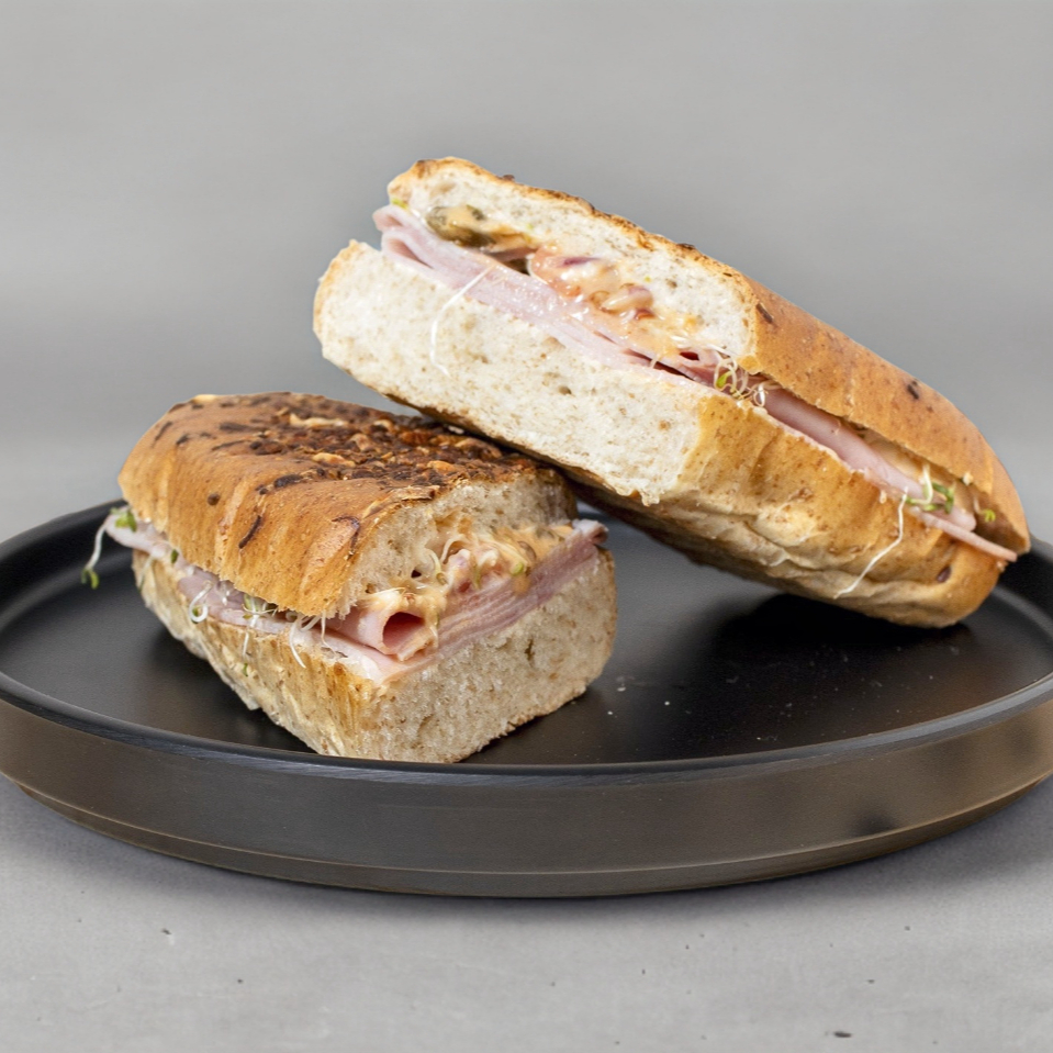 Delicioso panini artesanal relleno de jamón ahumado y suave queso panela, ligeramente dorado a la perfección.