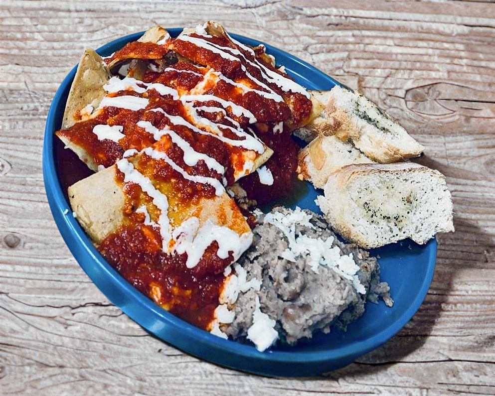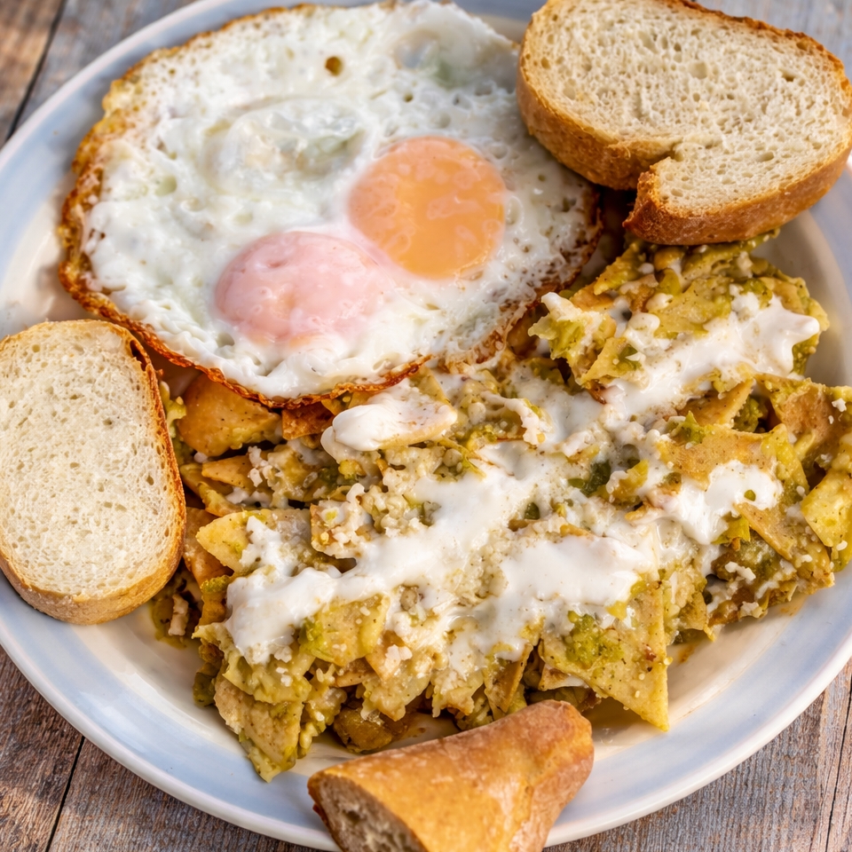 (platillo personal )Chilaquiles verdes con totopo dorado, salsa verde, frijoles, crema, queso, y trozos de birote.
