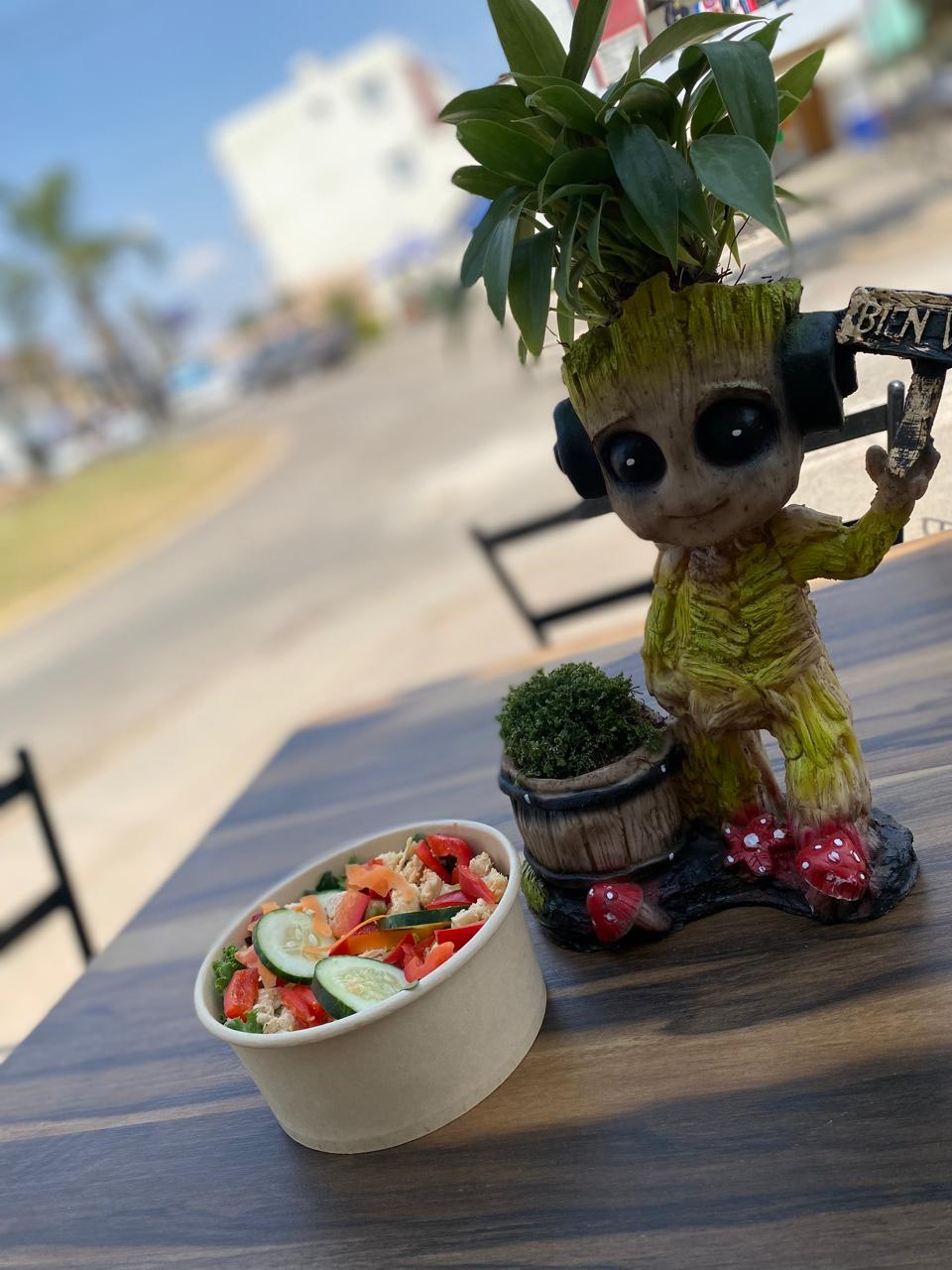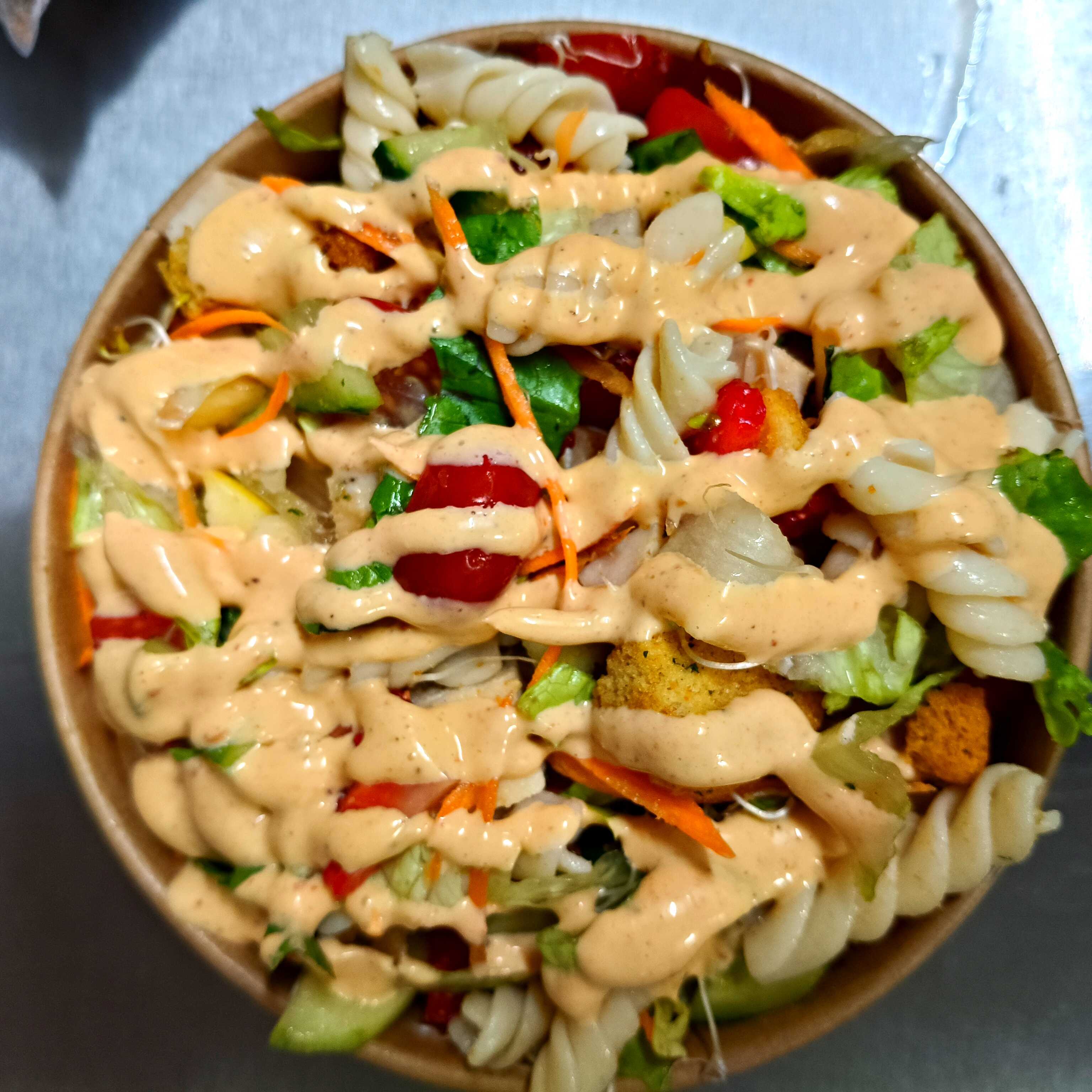 Base mix de lechuga, pasta, pepino, espinacas, germinado, chile morron , zanahoria, jitomate .
