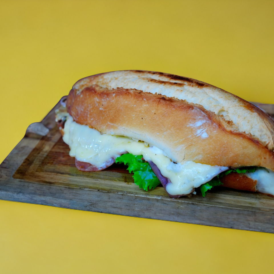 Sandwich de jamon de pavo, tocino, salchicha y Huevo estrellado tierno con queso gratinado acompañado de lechuga, jitomate, cebolla y chile jalapeño
