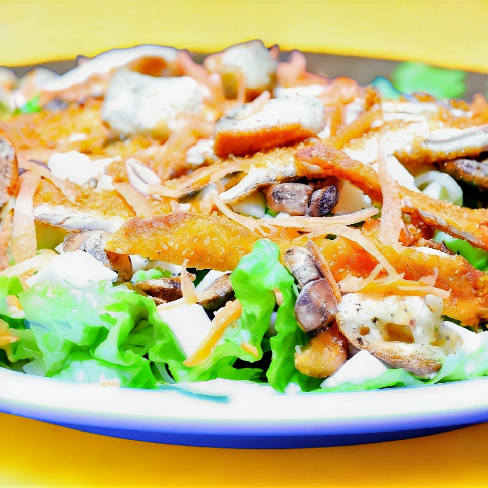Crocante lechuga italiana con pepino, pasta rotilly,120 gramos de pollo Empanizado, panela y champiñones con aderezo ranch, croutones y zanahoria