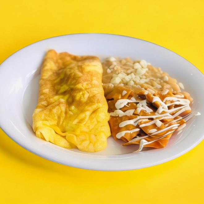 Omelette de Queso con Chilaquiles y Frijol