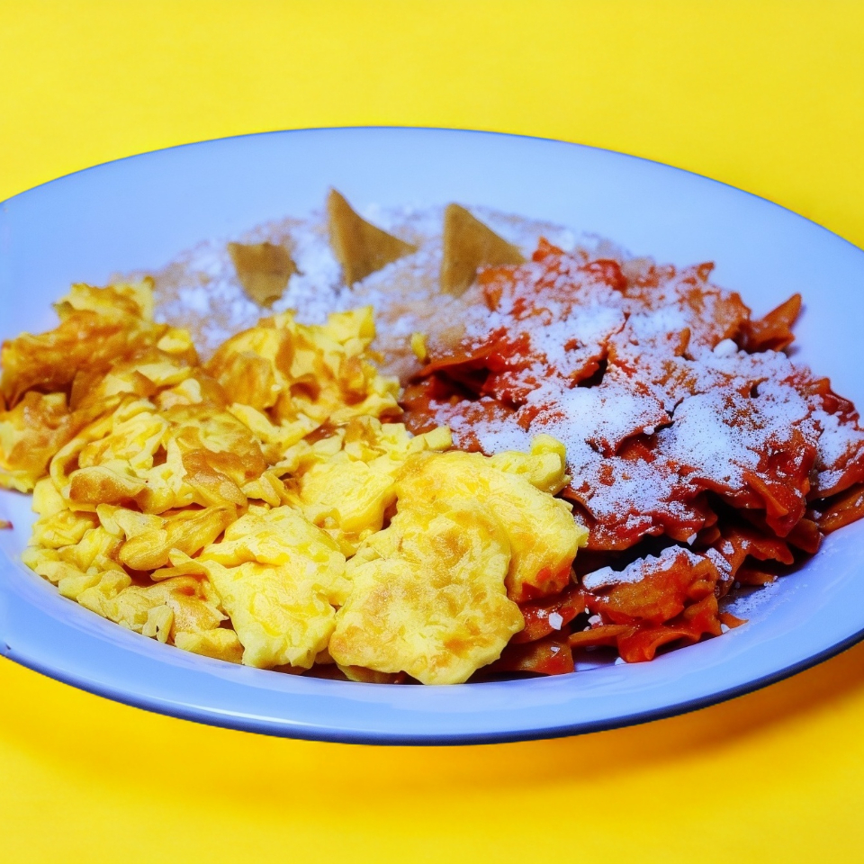 2 huevos revueltos acompañados de chilaquiles y frijol