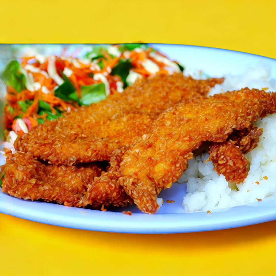 120 gramos de crujiente pollo Empanizado con arroz y ensalada acompañada de tortilla y chile de jitomate(la guarnición de arroz puede variar)