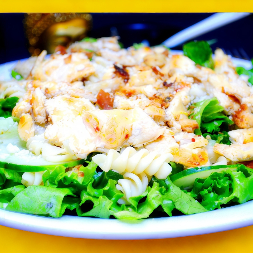 Crocante lechuga italiana con pepino pasta rotilly pollo a la plancha, croutones y aderezo Cesar de la casa