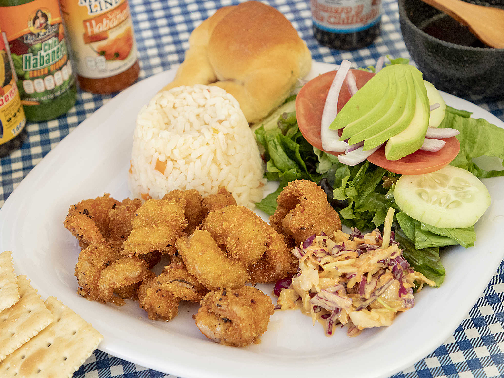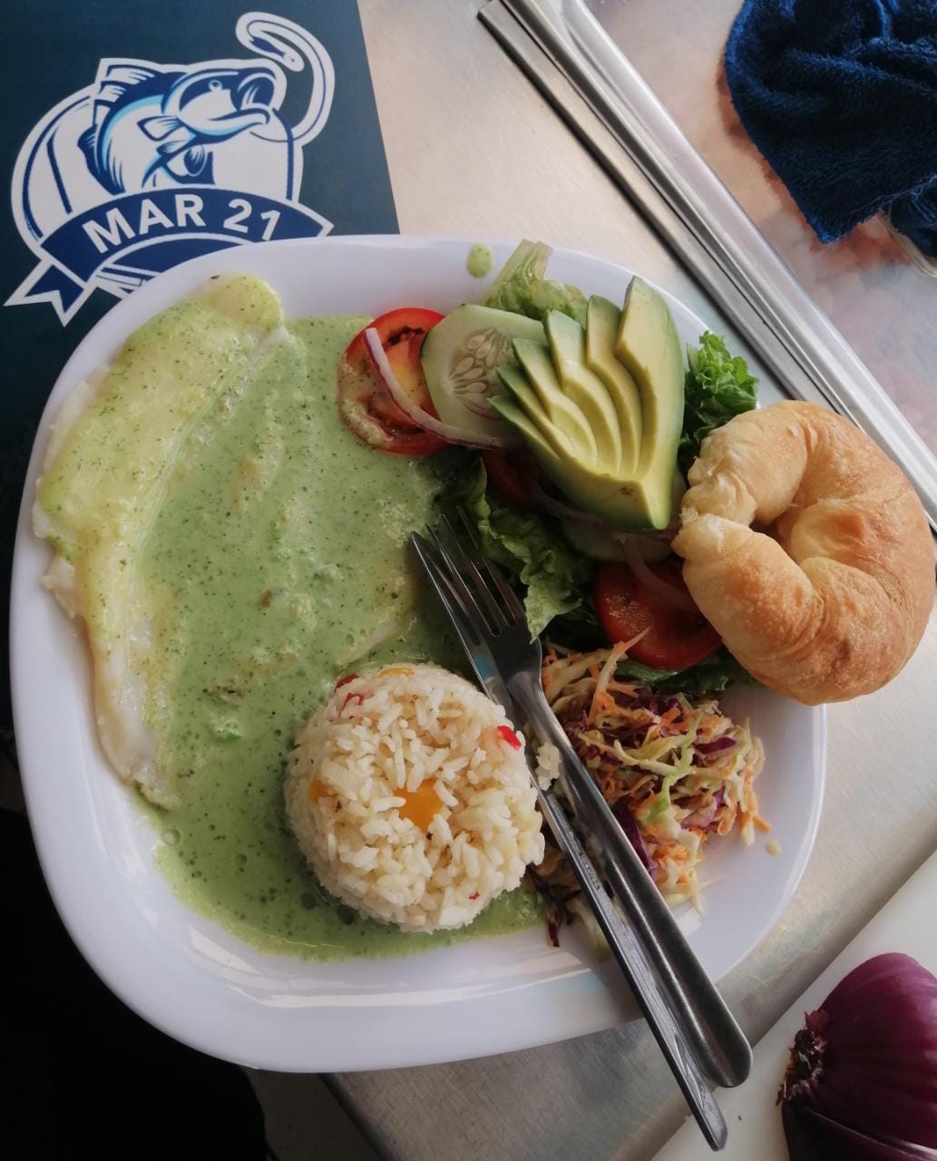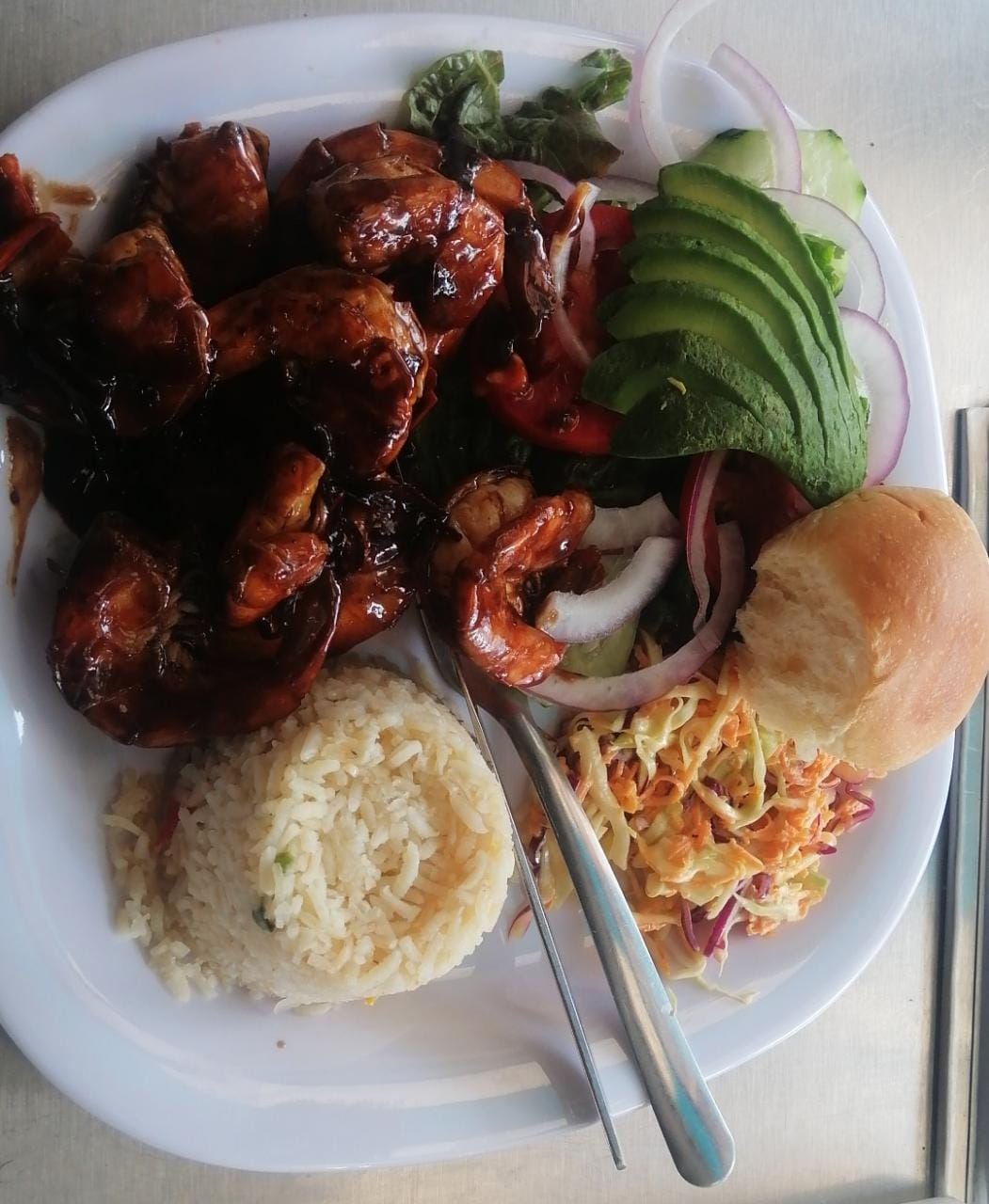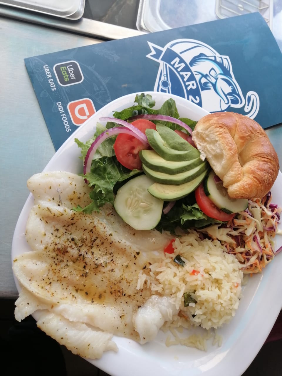 Acompañado de arroz, ensalada dulce, ensalada fresca, un delicioso pan de acompañamiento.