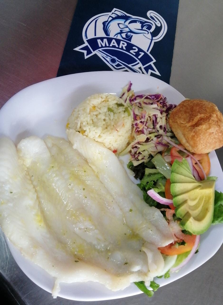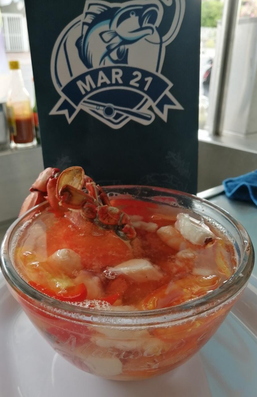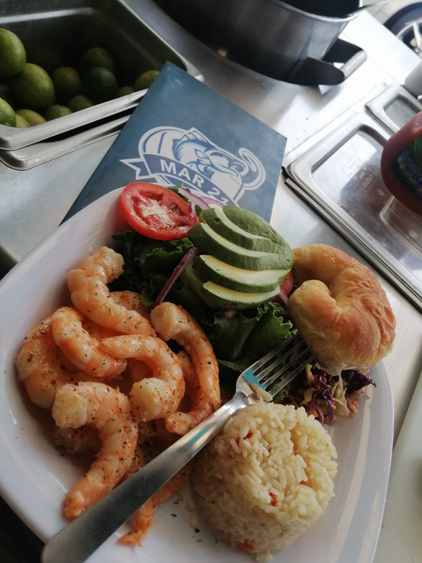 Camarón, pulpo, filete de pescado, jaiba y verduras mixta.
