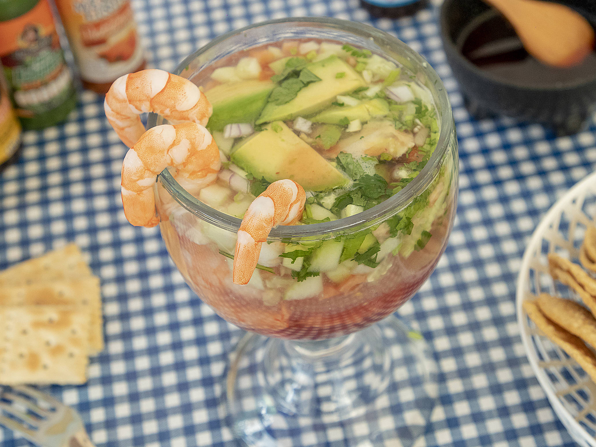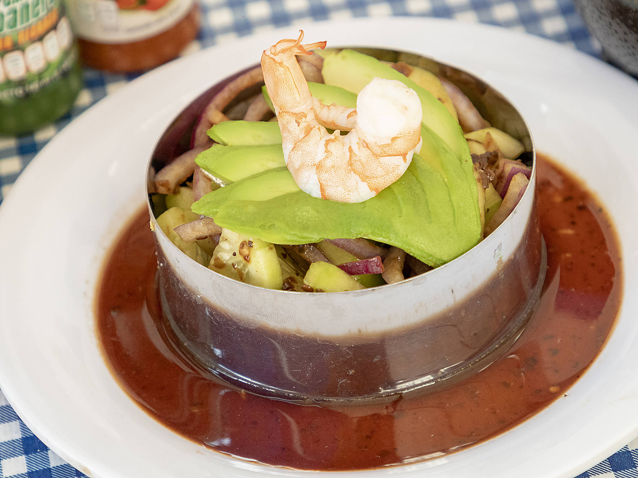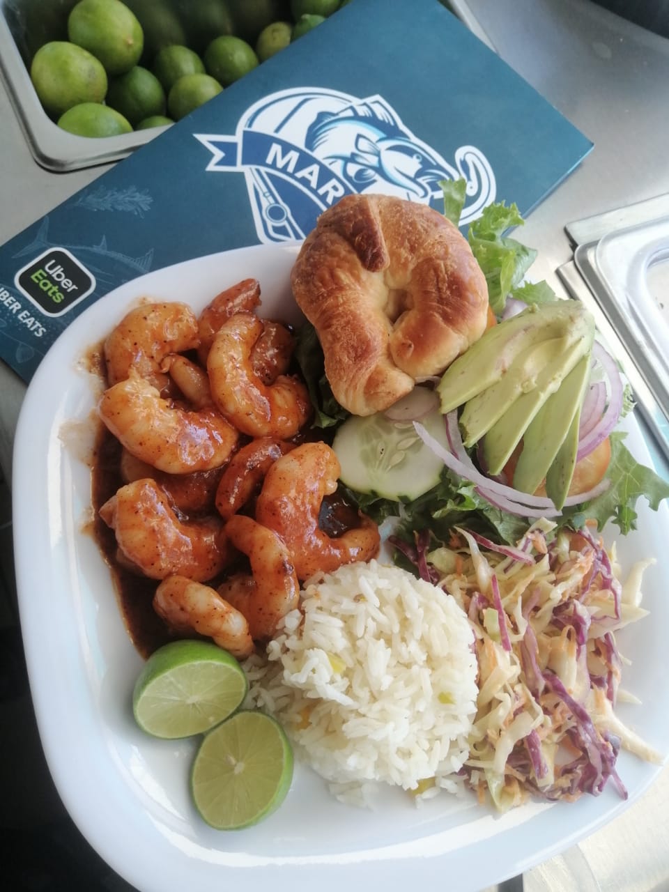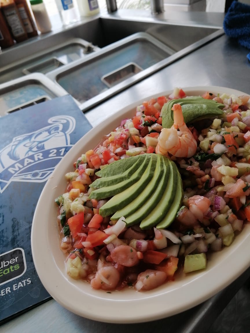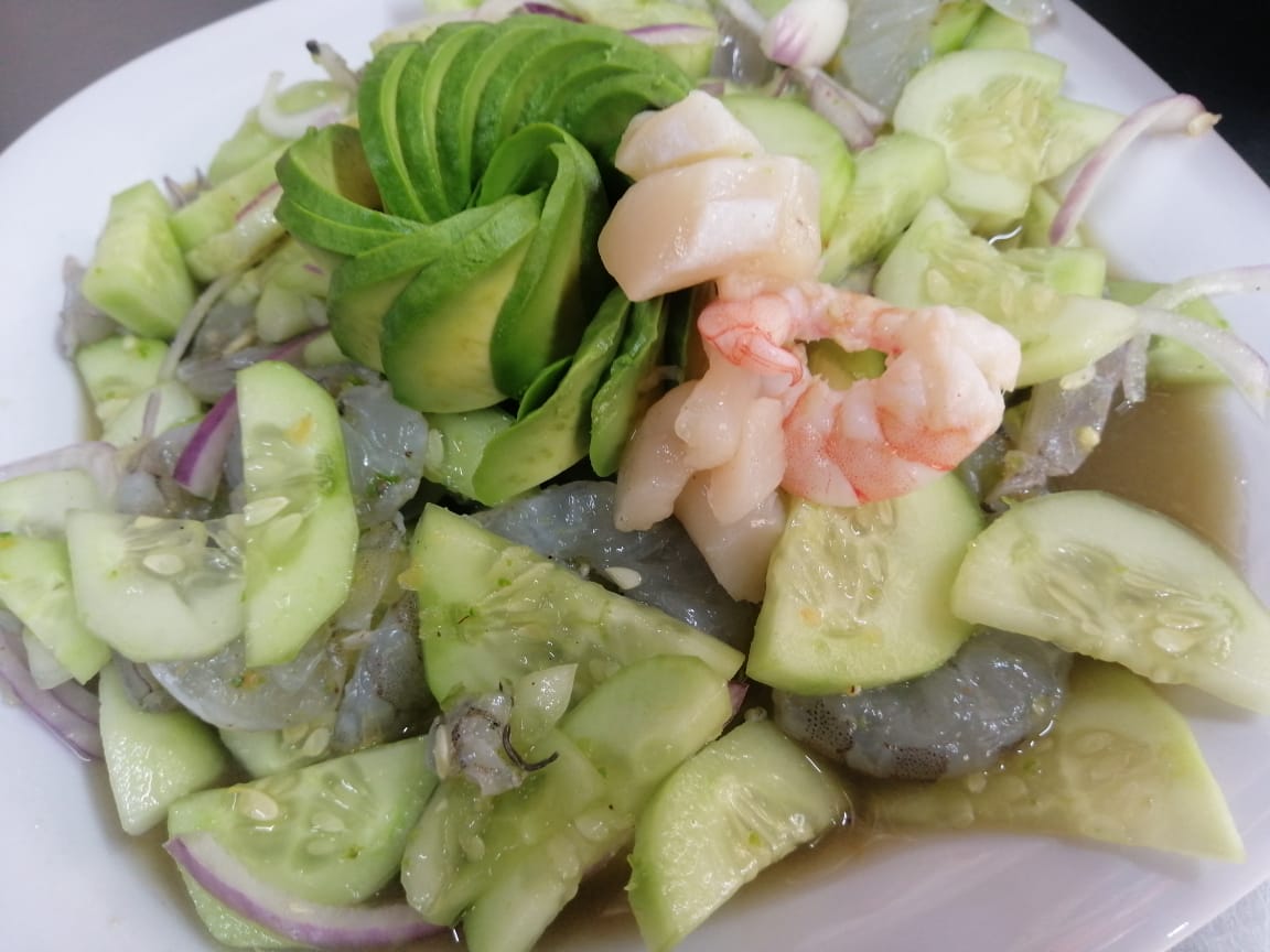 Camarón, limón, cebolla morada, pepino y salsa.