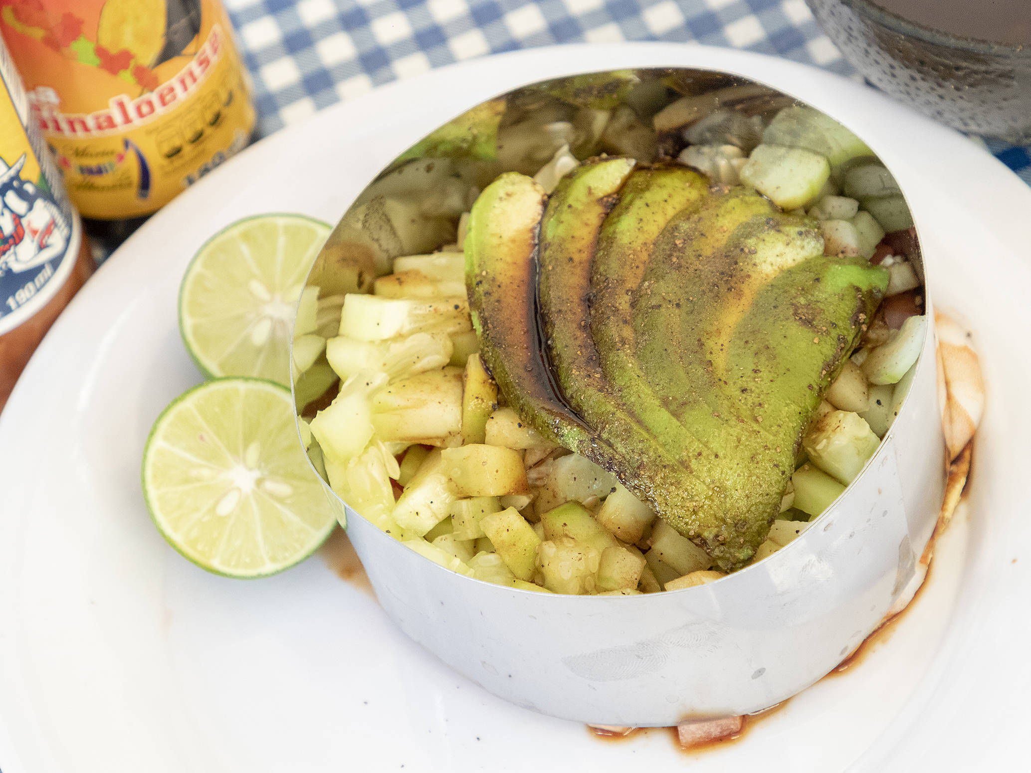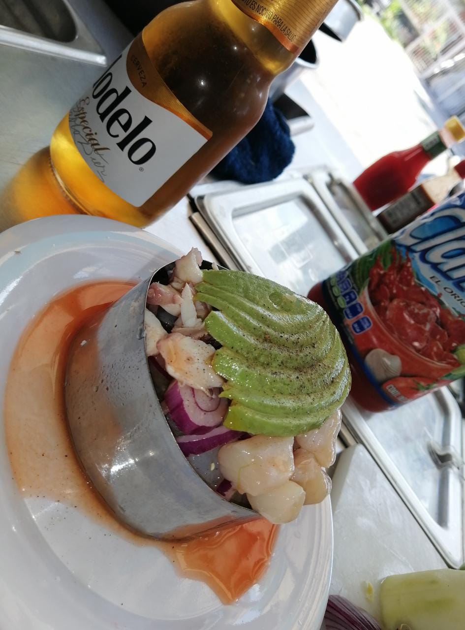Mayonesa, callo de almeja, cebolla, jitomate, pepino, cilantro, aguacate, pimienta y salsas negras.