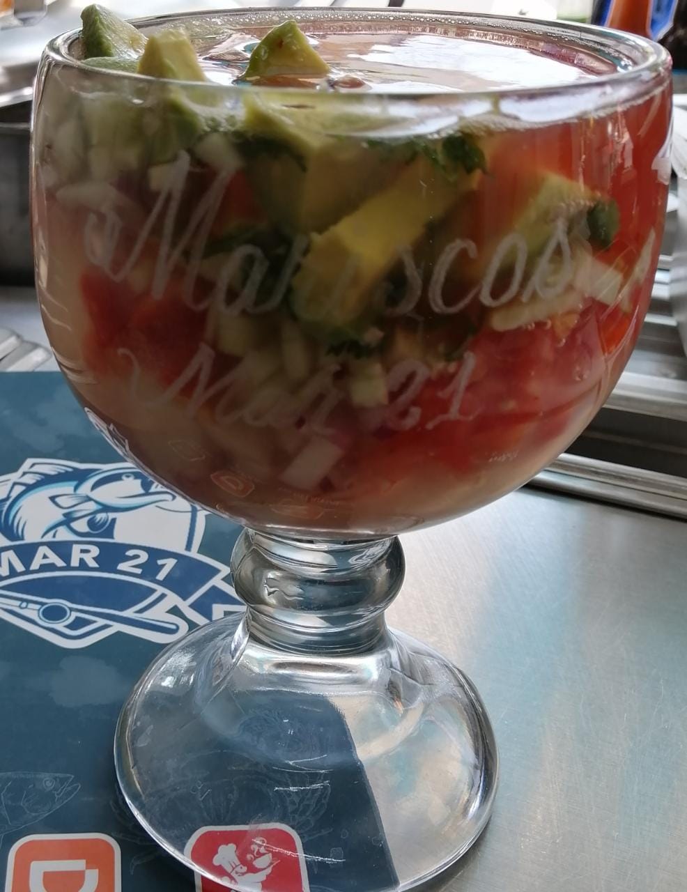 Coctel grande con Cebolla, cilantro, jitomate, aguacate, limón y cátsup.