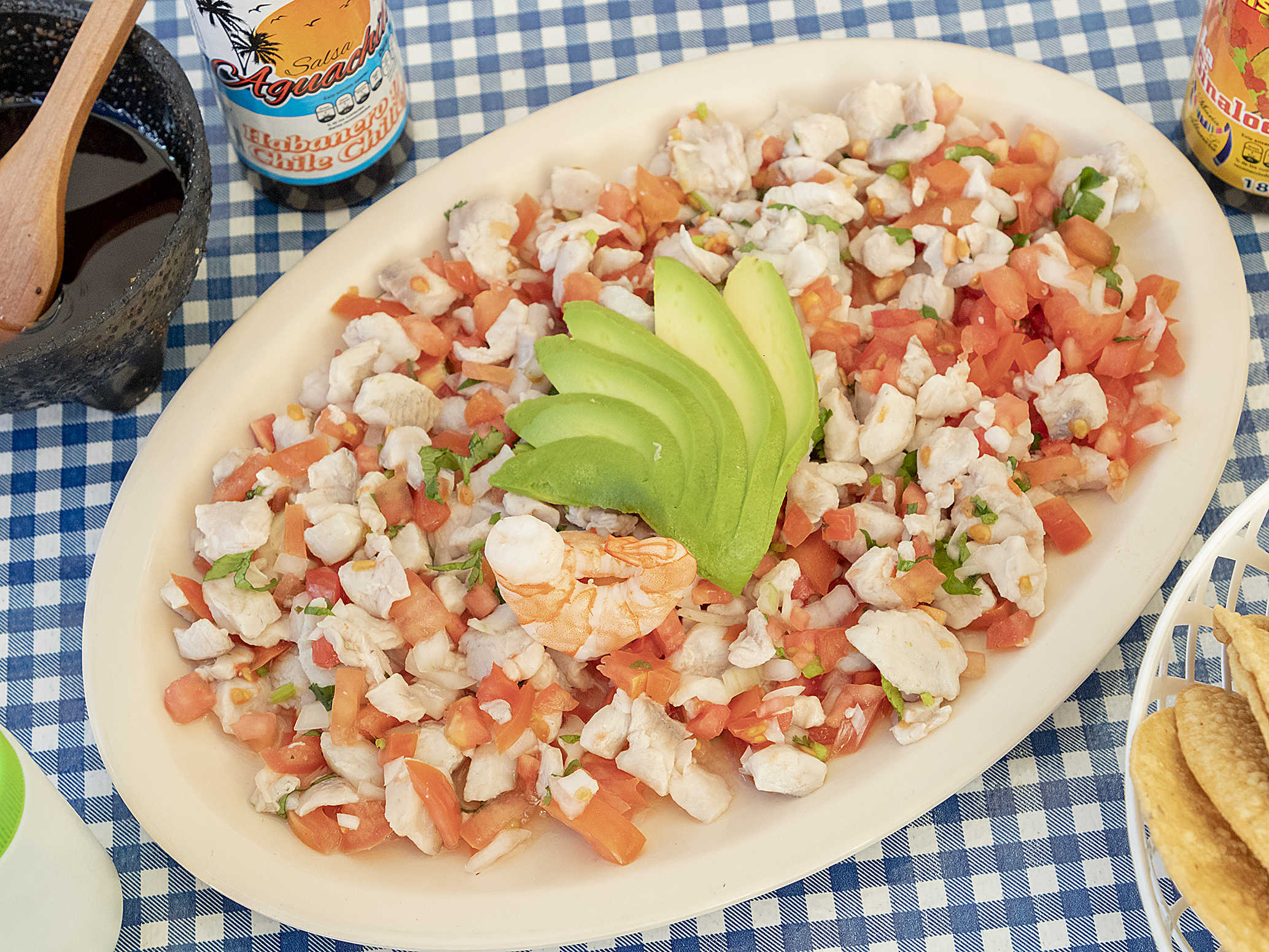 2 platillos de camarón a elegir, 1/2 litro de ceviche.
